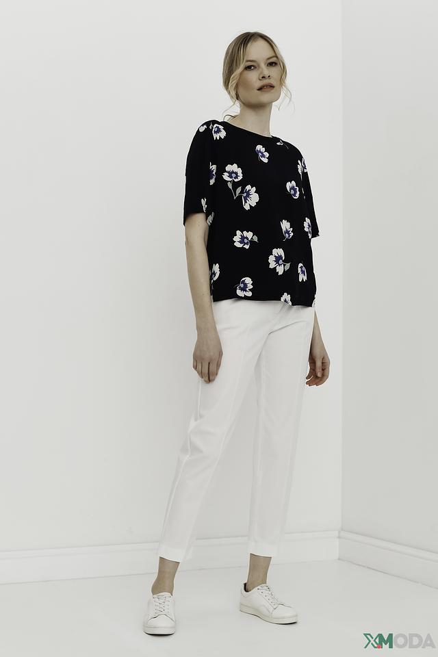Основной цвет блузы – черный, который служит идеальным фоном для яркого цветочного принта. Принт состоит из белых и голубых цветов, что придает блузе свежий и романтичный вид.