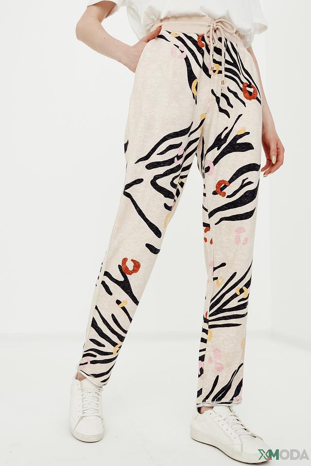 Женские брюки Oui бежевого цвета с оригинальным принтом в виде зебры — стильное и комфортное решение для повседневного образа. Модель выполнена из мягкой ткани с добавлением хлопка, модала и эластана. Состав: хлопок 49%, модал 48%, эластан 3%