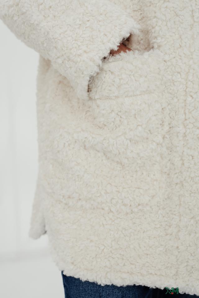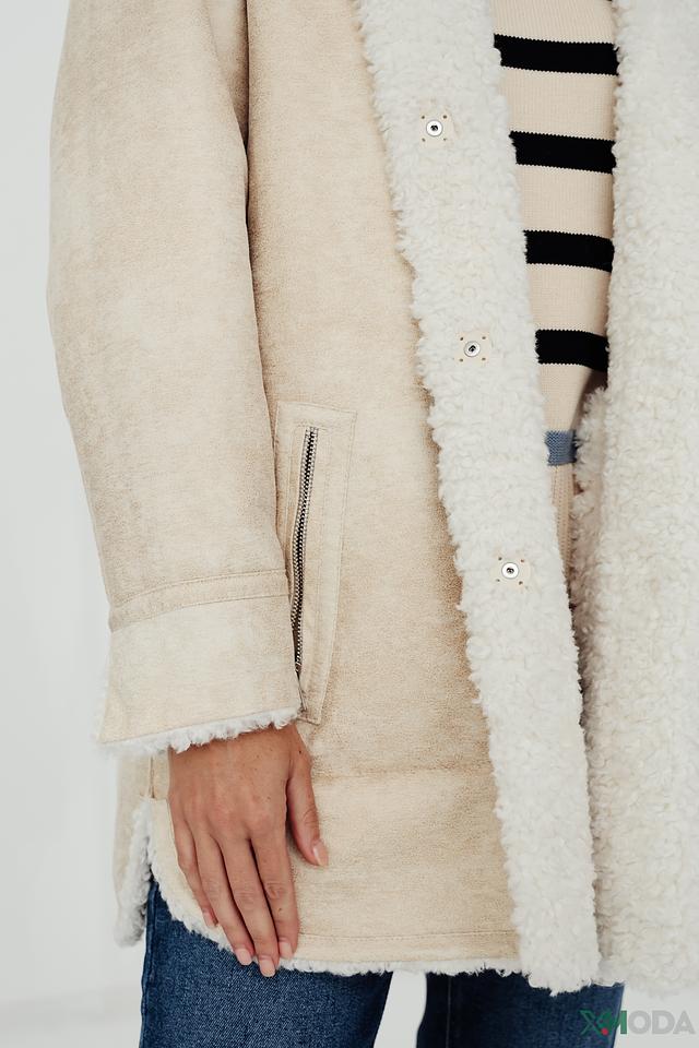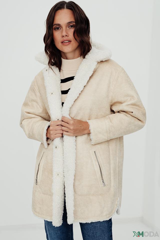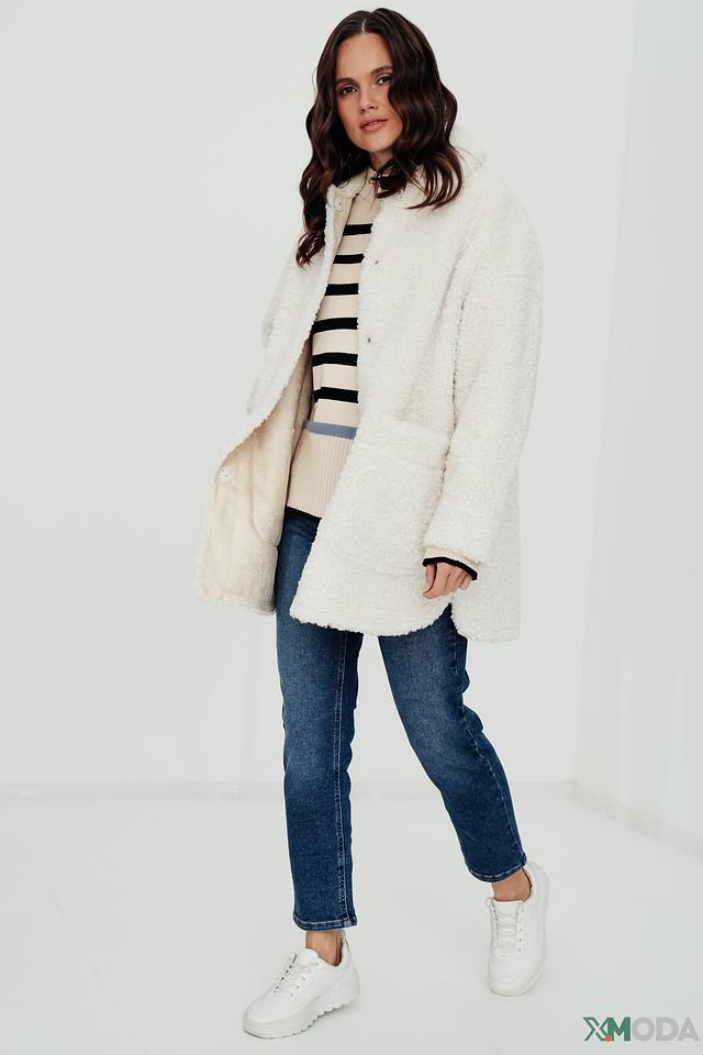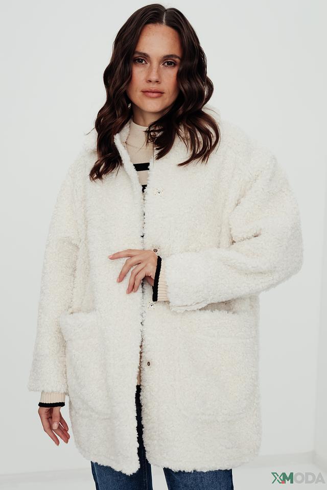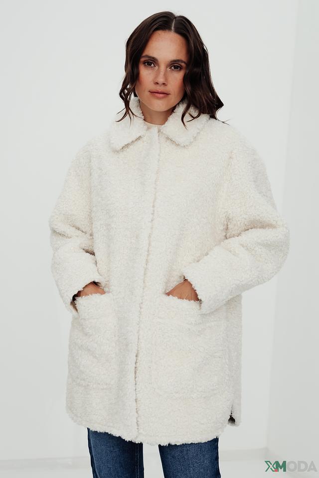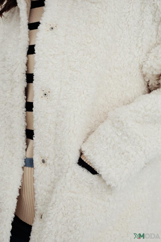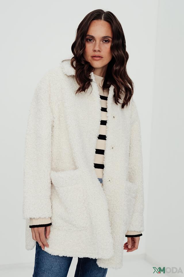 Пальто от бренда Oui – это стильное и комфортное решение для прохладной погоды. Модель выполнена в кремовом цвете из высококачественного искусственного меха, имитирующего мягкую шерсть.