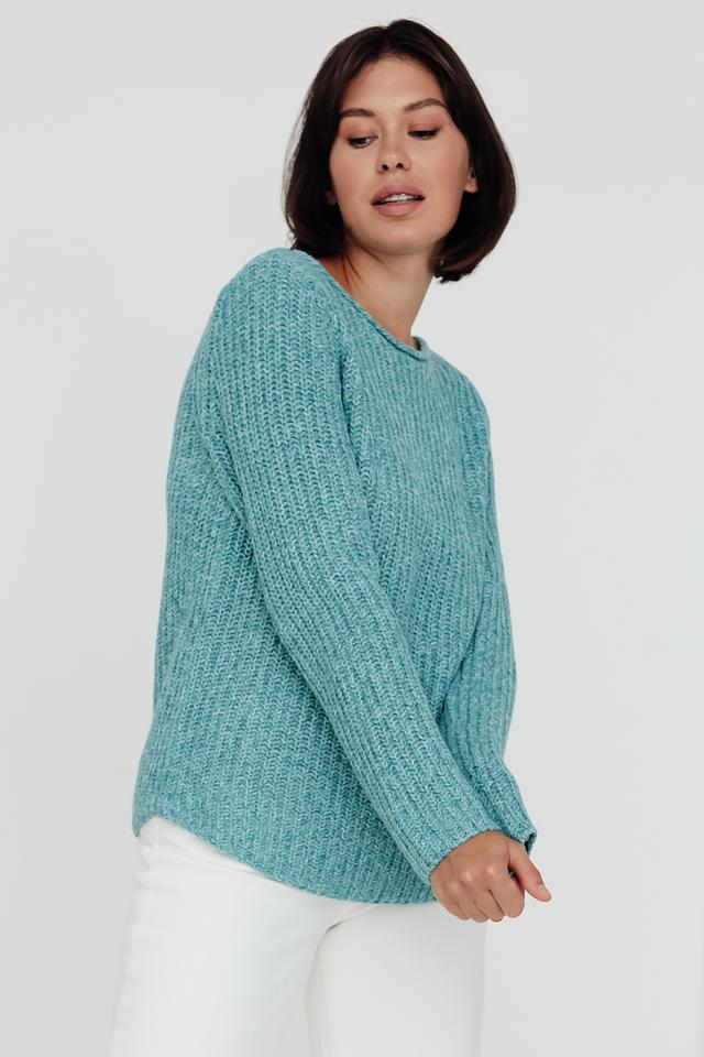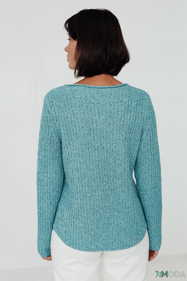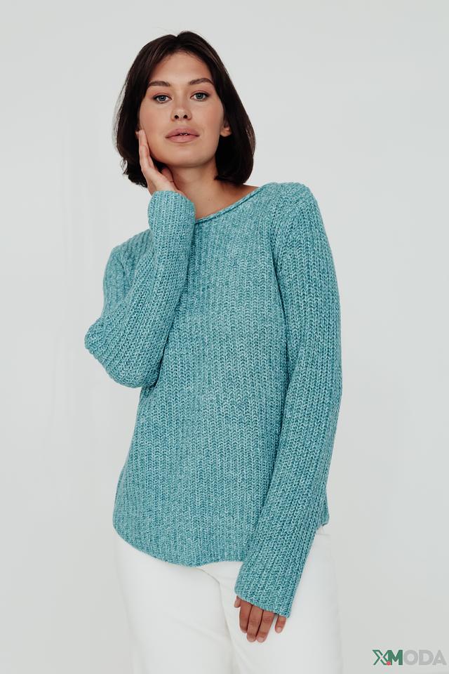 Пуловер имеет свободный крой, который не сковывает движений, и округлый вырез горловины. Текстурное вязаное полотно придает изделию особый шарм и уют. Бирюзовый цвет пуловера освежает образ и легко сочетается с другими элементами гардероба.