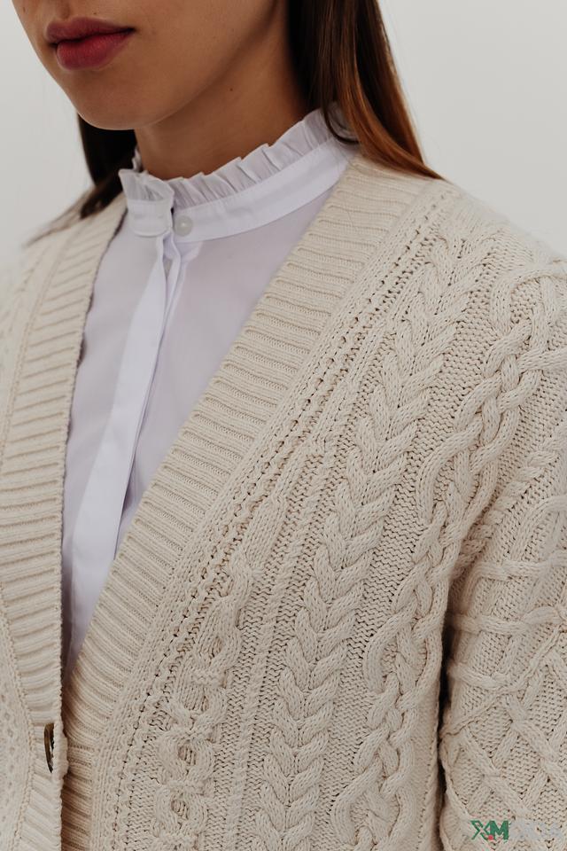 Кардиган имеет молочный цвет и украшен выразительным узором из кос, придающим ему особый шарм. V-образный вырез и застежка на пуговицы позволяют создавать различные образы, от повседневных до более элегантных.