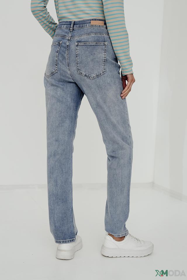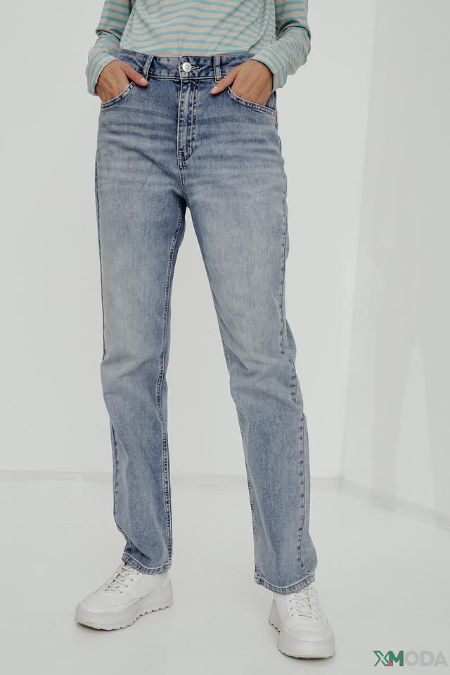 Джинсы имеют высокую посадку, которая подчеркивает талию и визуально удлиняет ноги. Прямой крой создает сбалансированный силуэт, подходящий для любой фигуры. Классическая застежка на пуговицу и пять карманов добавляют функциональности и практичности.