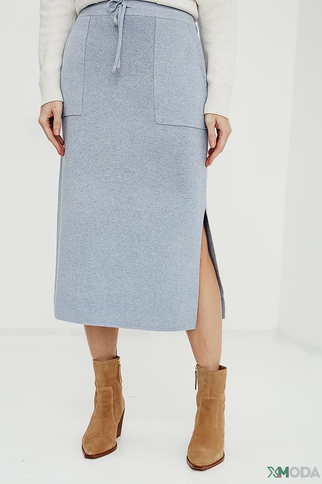 Модель имеет длину миди и прямой крой, который подчеркивает фигуру. Эластичный пояс дополнен шнурком для регулировки посадки. Сбоку юбка имеет разрез, добавляющий образу динамичности и легкости.