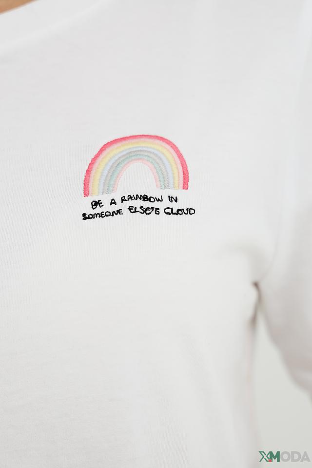 Особенностью данной модели является яркий и красочный принт радуги, расположенный на передней части футболки. Этот принт добавляет образу позитива и оригинальности, делая его запоминающимся и привлекательным.