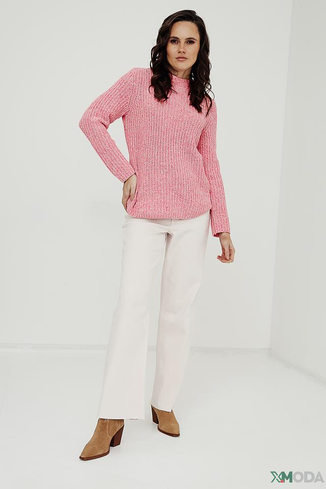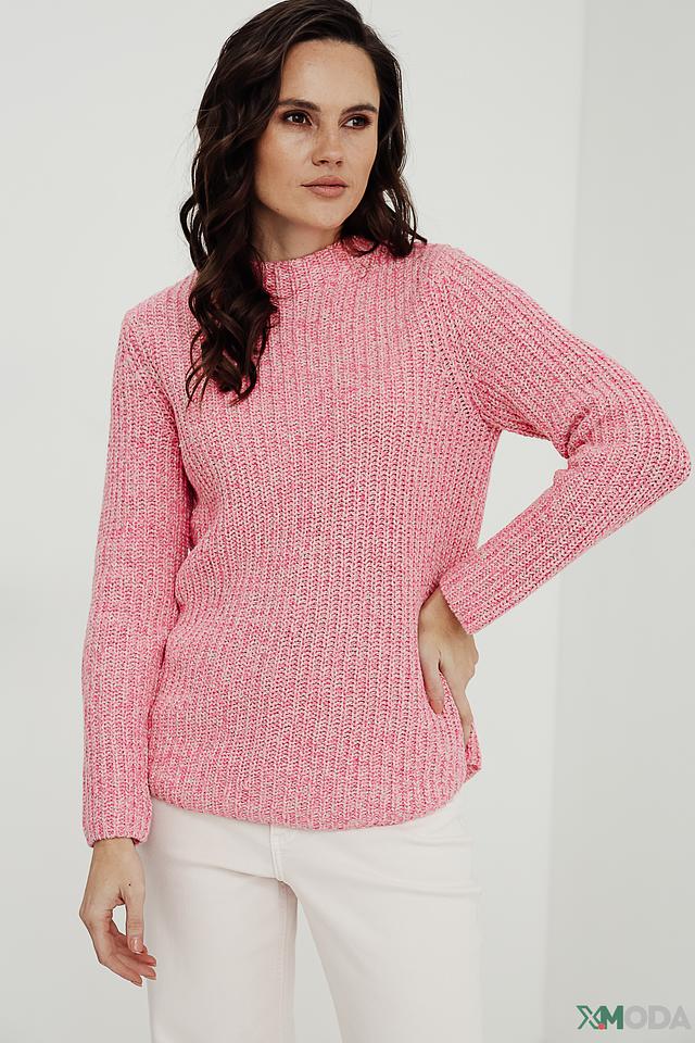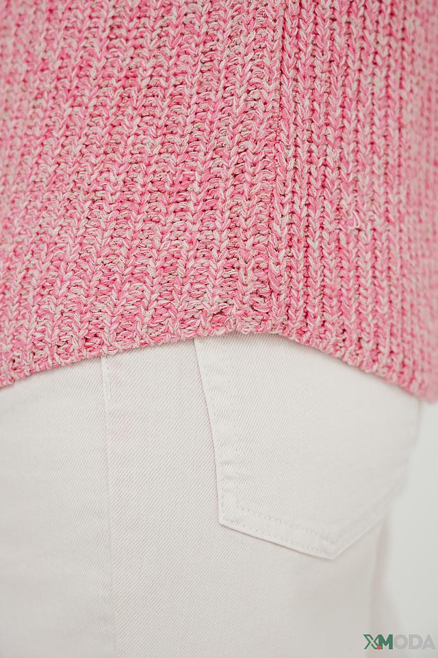 Пуловер имеет нежно-розовый цвет и выполнен в технике крупной вязки, что придает ему объем и текстуру. Вырез горловины классической формы, не слишком глубокий и не слишком высокий, что делает его универсальным для разных типов внешности.