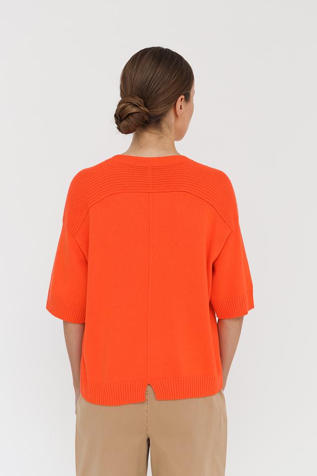 Оранжевый пуловер от Oui с короткими рукавами и круглым вырезом. Изготовлен из мягкого трикотажа с акцентной вязкой на плечах и рукавах, станет ярким акцентом в вашем образе. Состав: хлопок 55%, вискоза 25%, полиамид 20%