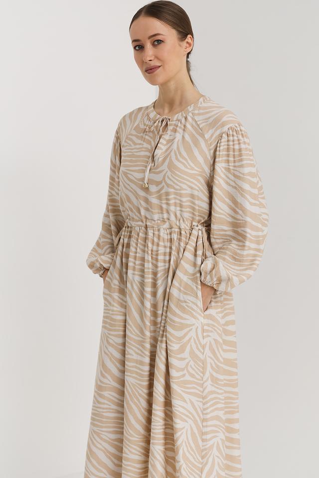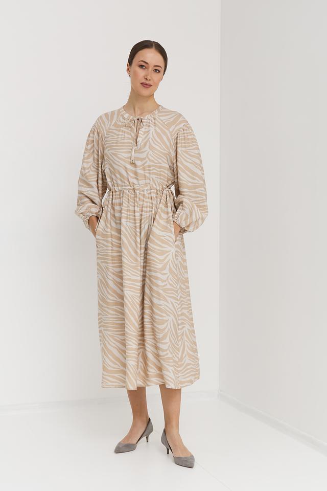 Платье от Oui бежевого цвета с оригинальным принтом "зебра" станет отличным дополнением к вашему гардеробу. Модель с длинными рукавами и завязками на горловине подчеркнет вашу женственность и индивидуальность. Состав: вискоза 84%, полиамид 16%