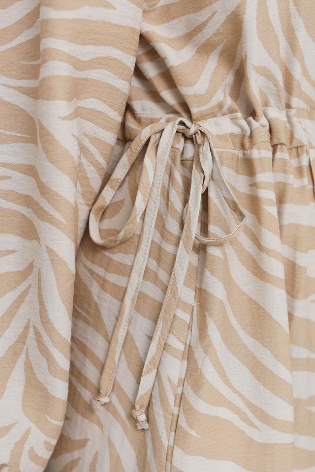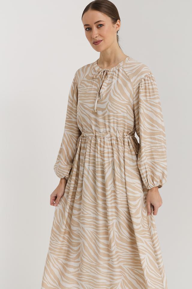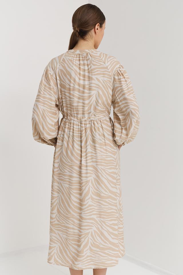Это стильное платье от бренда Oui выполнено в бежевых тонах с эффектным принтом, имитирующим окрас зебры. Платье имеет длину миди и свободный крой, который обеспечивает комфорт в носке.