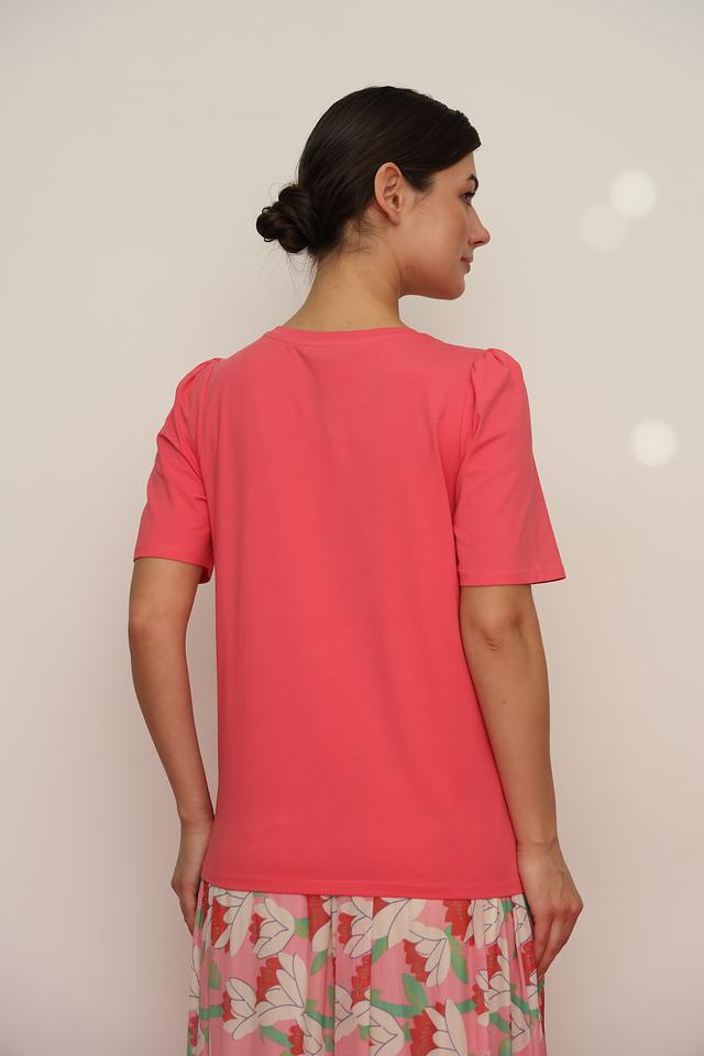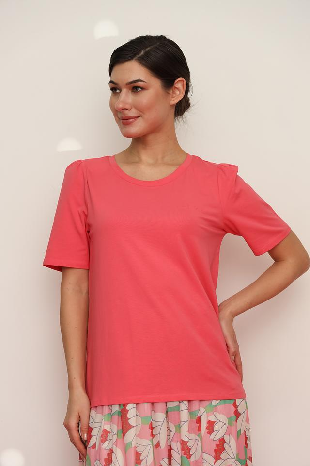 Коралловая футболка от Oui с короткими рукавами-фонариками. Эта модель имеет свободный крой и круглый вырез горловины. Изготовлена из мягкого хлопка с добавлением эластана для комфорта и лучшей посадки. Состав: хлопок 95%, эластан 5%