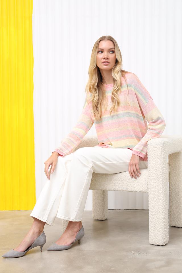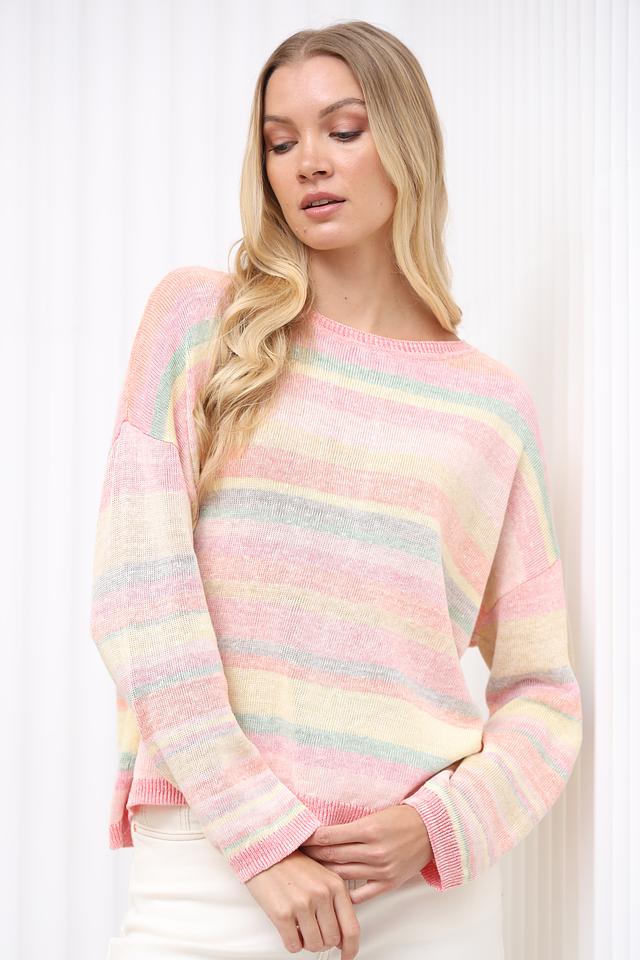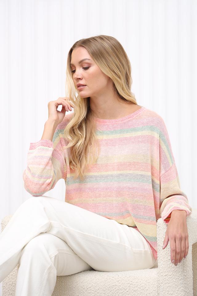 Пуловер имеет свободный крой, который не сковывает движений и позволяет создать расслабленный образ. Дизайн изделия выполнен в виде широких горизонтальных полос различных оттенков, создающих эффектный и запоминающийся вид.