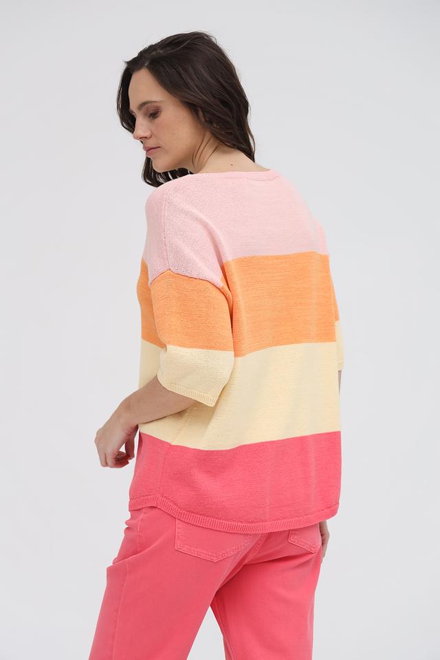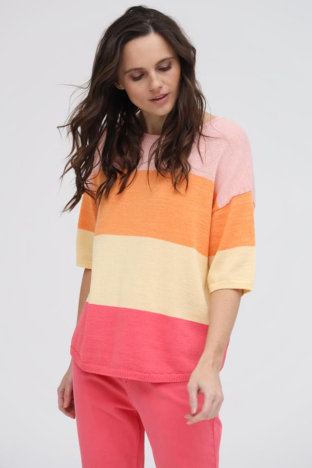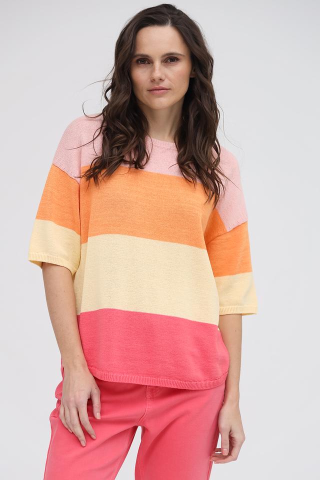 Женский пуловер Oui оранжево-розовой расцветки с короткими рукавами. Модель выполнена в полоску и станет ярким акцентом в вашем образе. Состав изделия включает хлопок и полиамид. Состав: хлопок 80%, полиамид 20%