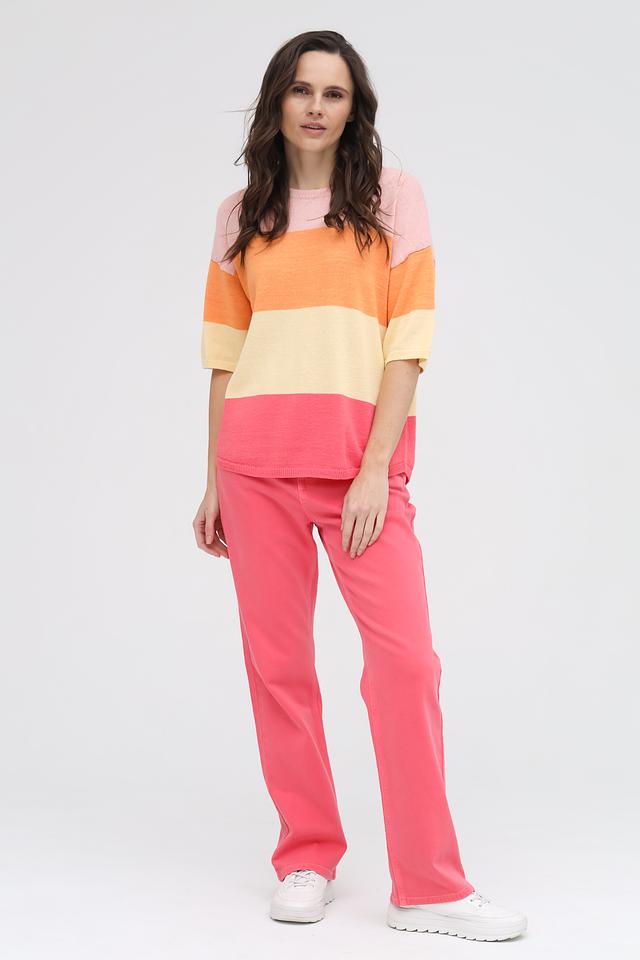 Этот стильный пуловер от Oui станет отличным дополнением к вашему гардеробу. Модель выполнена в яркой оранжево-розовой цветовой гамме с горизонтальными полосами.