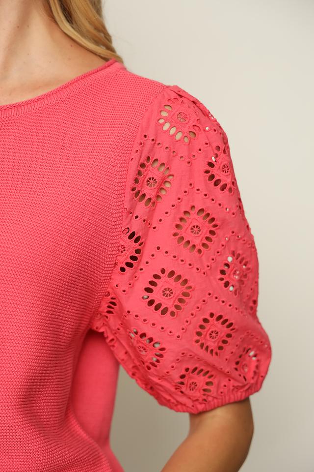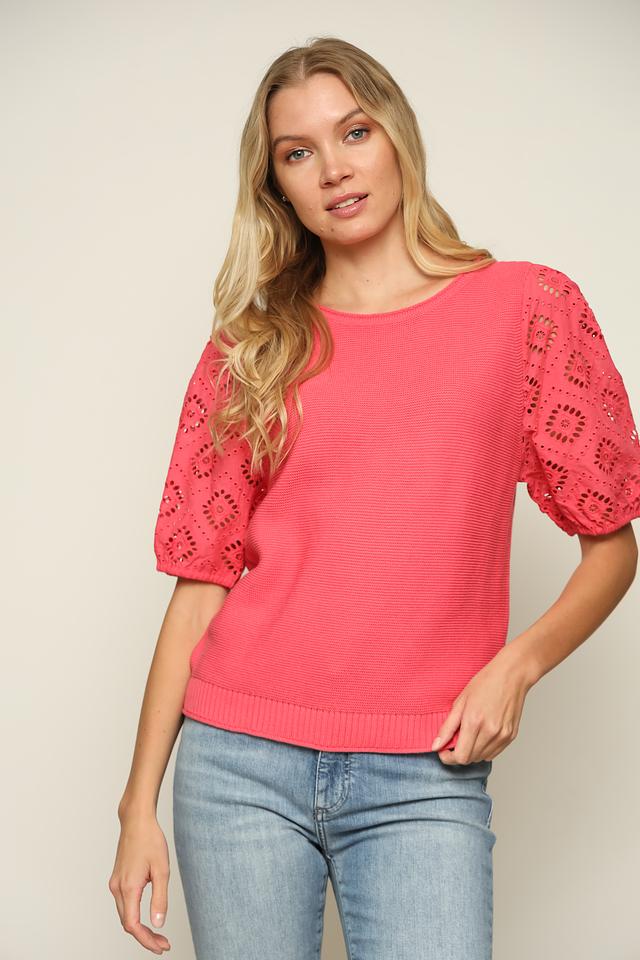 Пуловер имеет яркий коралловый цвет, который освежит ваш образ и добавит в него нотку женственности. Короткие рукава с ажурным узором придают модели особый шарм и изысканность. Круглый вырез горловины делает пуловер универсальным и подходящим для различных типов фигуры.