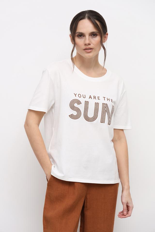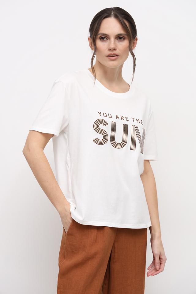 Особенностью данной модели является стильный принт "You are the sun", выполненный в графичных тонах. Футболка имеет свободный крой, который не сковывает движений, и короткие рукава, что делает ее идеальным выбором для теплой погоды.