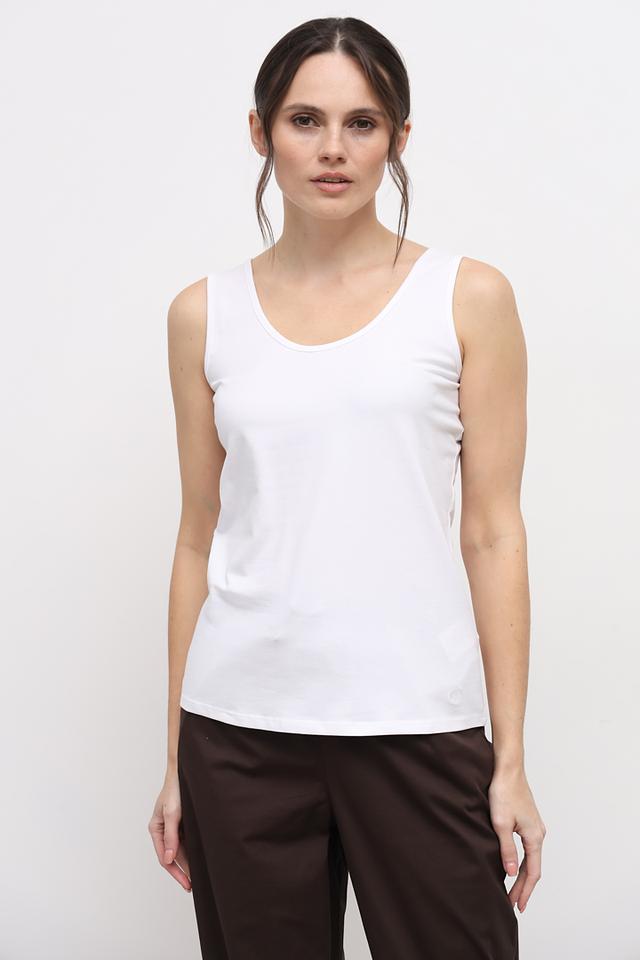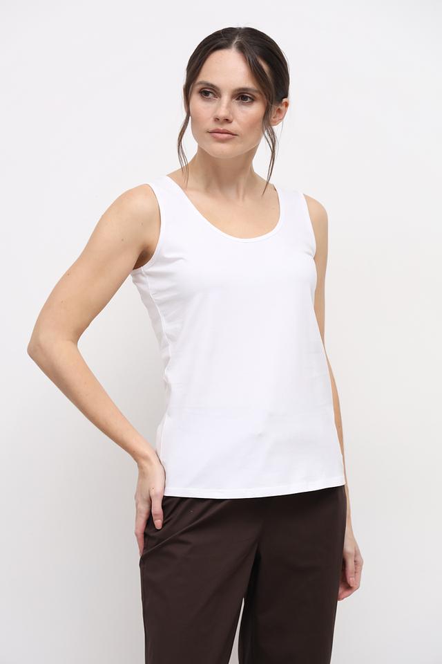 Топ имеет классический крой с округлым вырезом горловины и широкими бретелями. Благодаря простому дизайну, его легко сочетать с различными элементами одежды – джинсами, брюками, юбками или шортами.