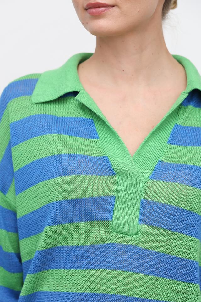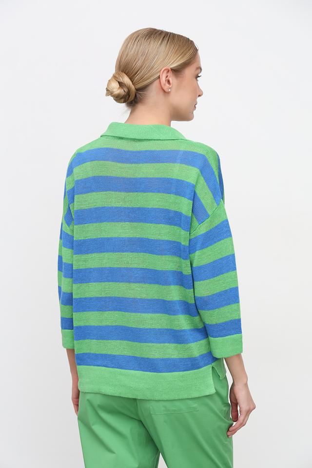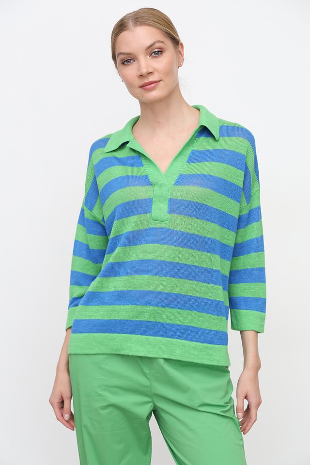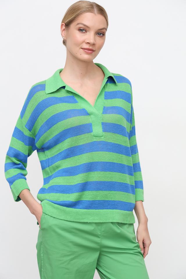 Женский пуловер Oui зелёного цвета с ярким полосатым узором и воротником-поло. Модель выполнена из натурального льна, что обеспечивает комфорт и воздухопроницаемость в тёплую погоду. Состав: лен 100%