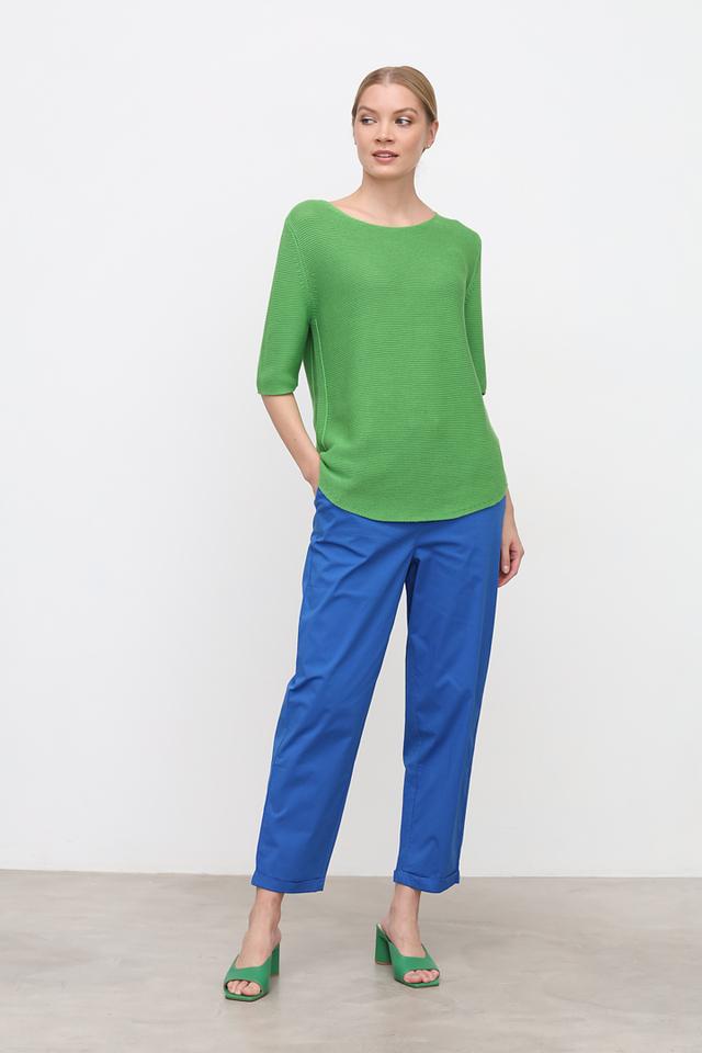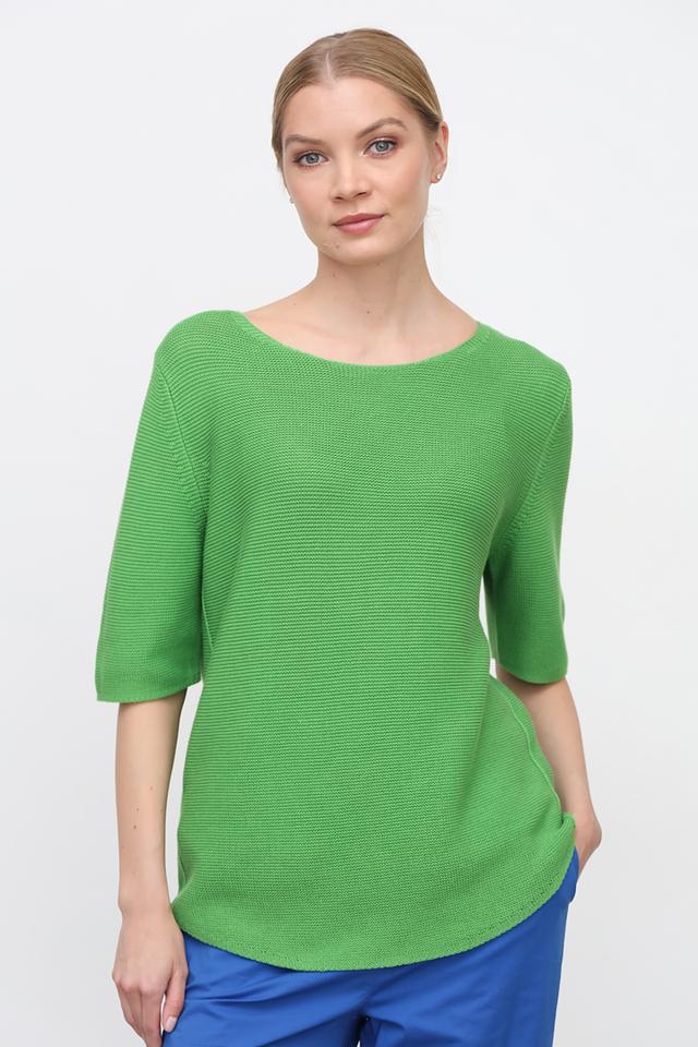 Пуловер имеет классический зелёный цвет и свободный крой, который позволяет легко сочетать его с различными элементами одежды. Округлый вырез горловины и рукав три четверти придают модели элегантный и современный вид.