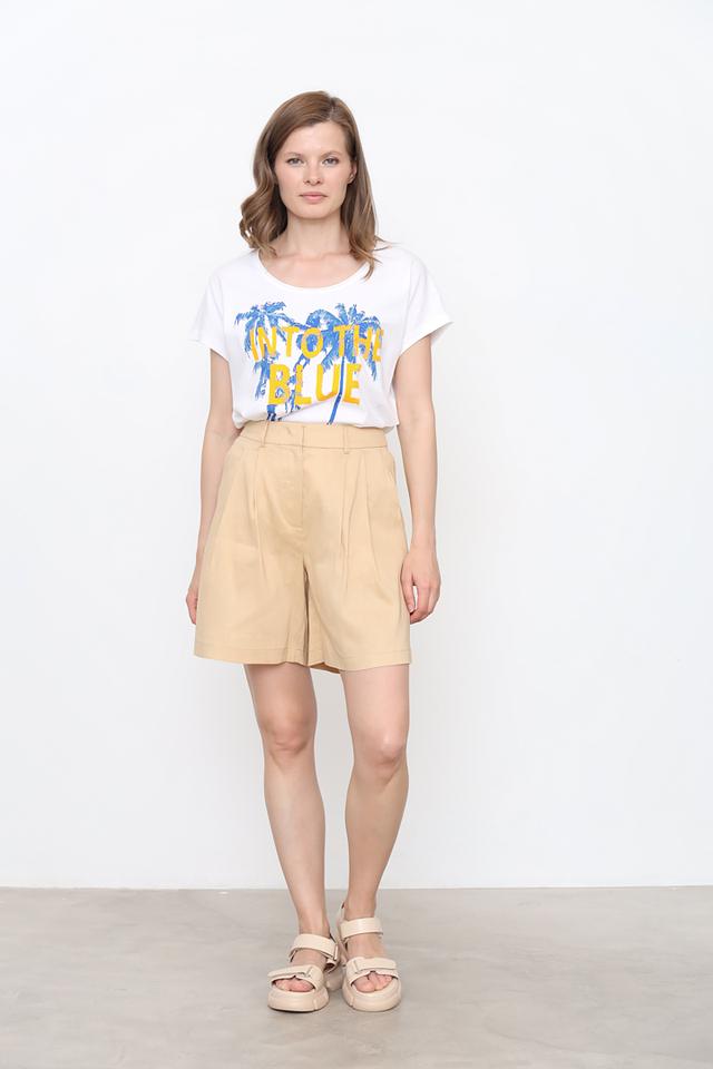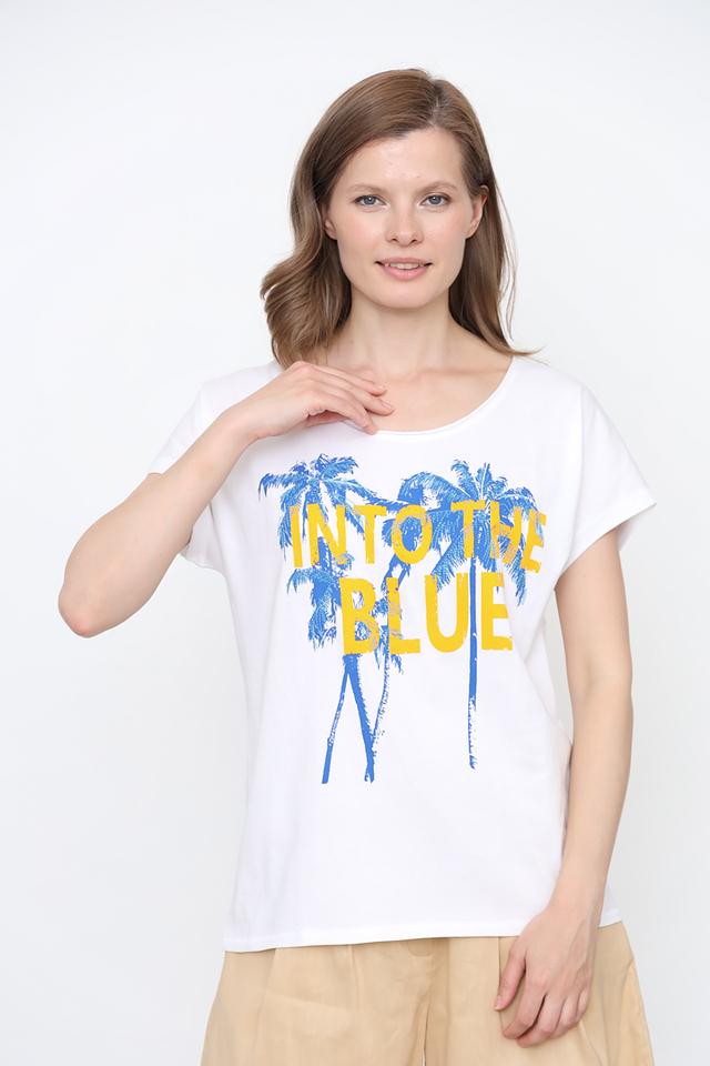 Белая футболка от Oui с ярким принтом "Into the Blue" в виде пальм и надписи. Изготовлена из 100% хлопка, обеспечивающего комфорт и воздухопроницаемость. Стильный и оригинальный выбор для повседневного образа. Состав: хлопок 100%