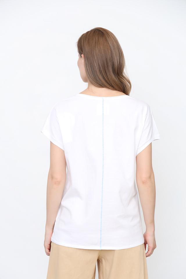 Футболка имеет свободный крой, который не сковывает движений и позволяет чувствовать себя комфортно в любой ситуации. Округлый вырез горловины и короткие рукава делают её идеальным выбором для тёплой погоды. На спине присутствует небольшая декоративная вставка из голубой ткани.