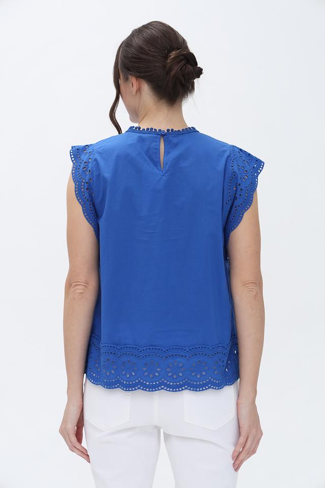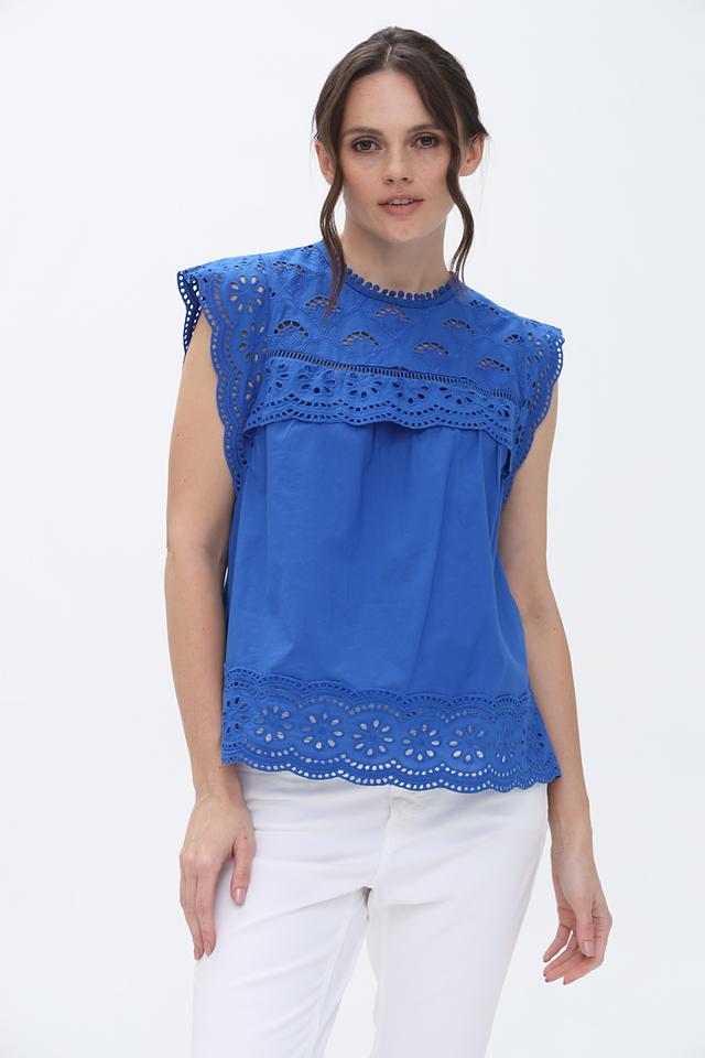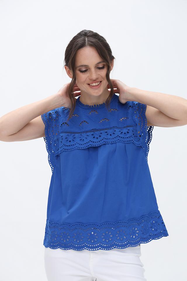 Синяя блуза от Oui с изысканной вышивкой коклюшками. Модель выполнена из 100% хлопка, имеет короткие рукава и округлый вырез горловины. Легкий и воздушный силуэт идеально подойдет для создания летних образов. Состав: хлопок 100%