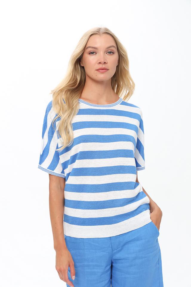 Пуловер имеет классический прямой крой и короткие рукава, что придаёт ему непринуждённый вид. Голубая полоска добавляет свежести и динамики образу. Круглый вырез горловины делает модель универсальной и подходящей для различных типов фигуры.