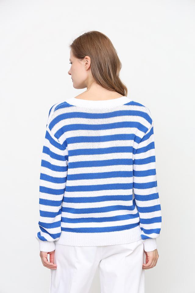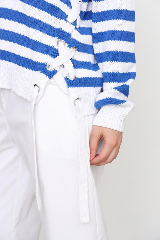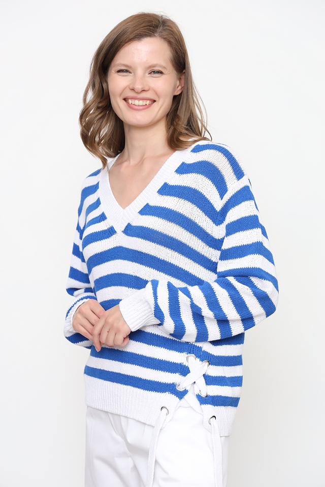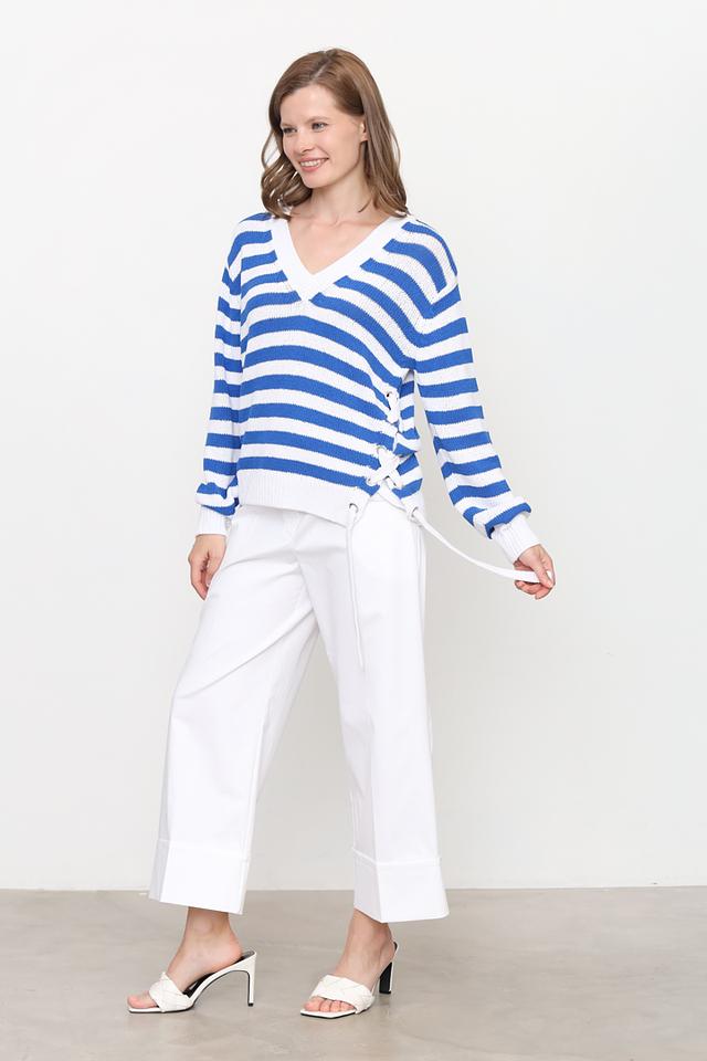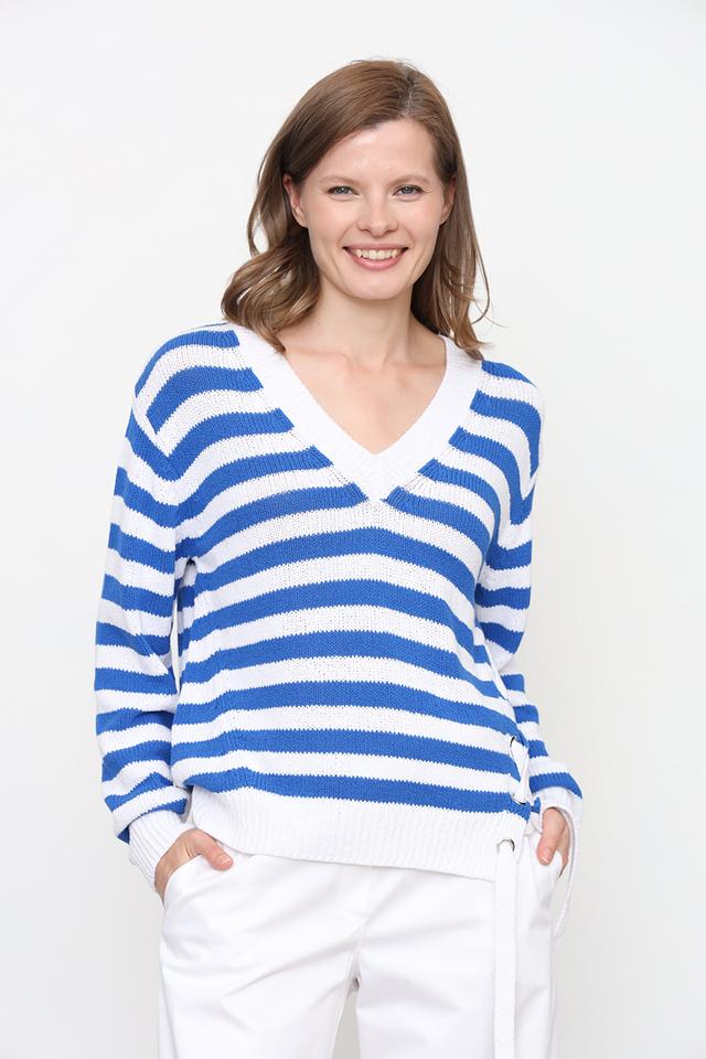 Женский пуловер Oui синего и белого цвета с V-образным вырезом и оригинальным дизайном с завязками по бокам. Изготовлен из 100% хлопка, обеспечивающего комфорт и удобство в носке. Состав: хлопок 100%