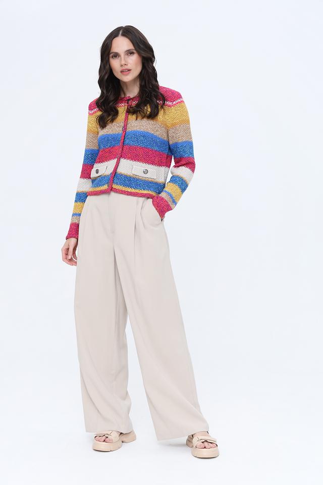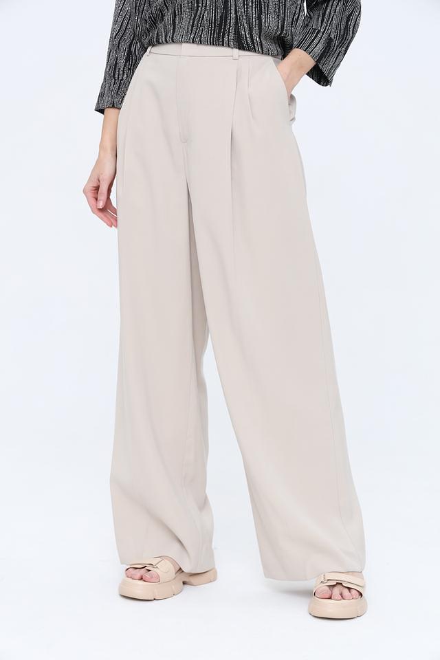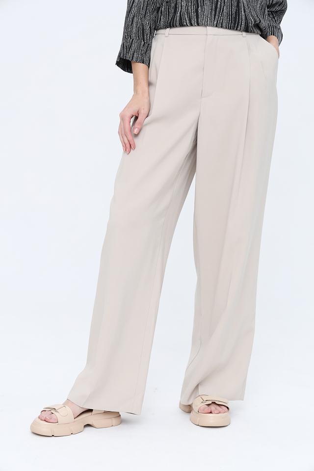 Брюки имеют прямой крой, высокую посадку и широкие штанины, что создает элегантный и современный силуэт. Наличие боковых карманов добавляет практичности. Застежка на молнию и пуговицу обеспечивает надежную фиксацию.