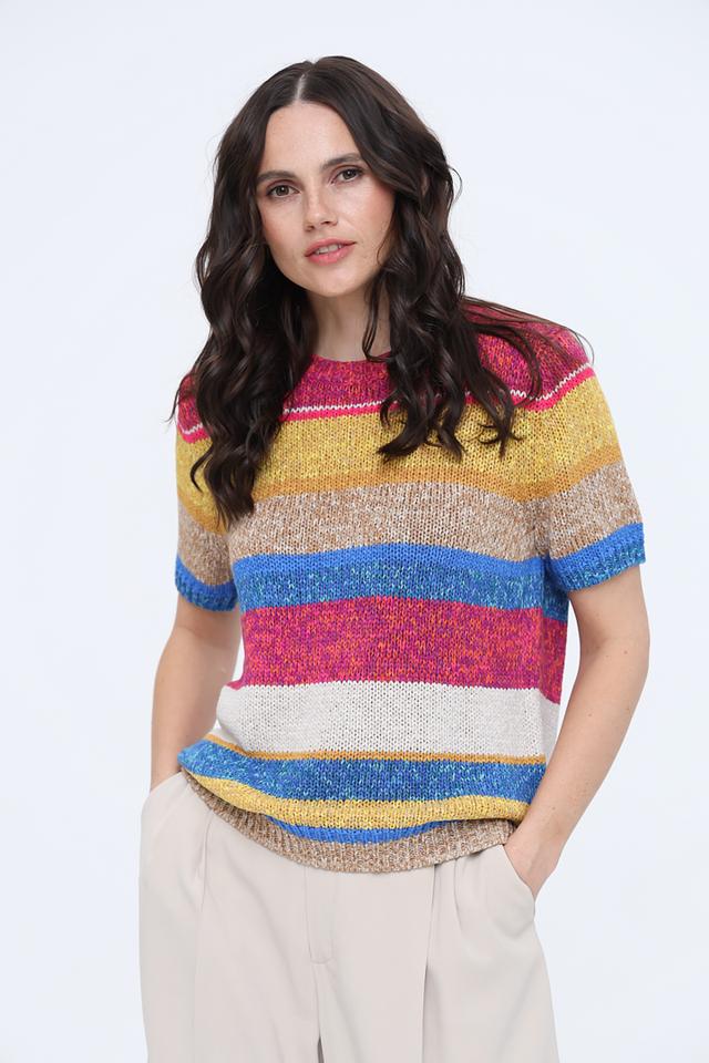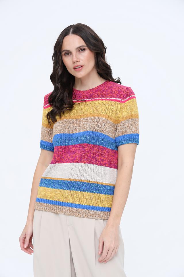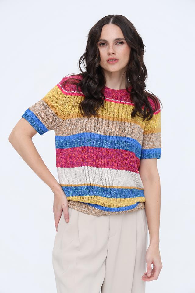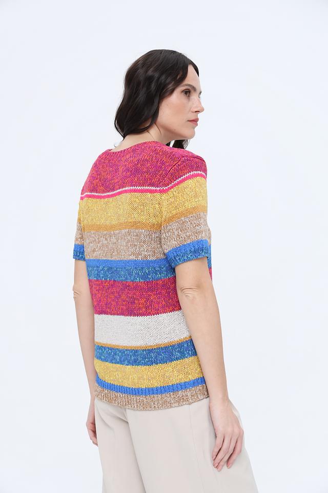 Пуловер имеет короткий рукав и круглый вырез горловины. Его главная особенность – яркий, многоцветный полосатый узор, сочетающий в себе оттенки жёлтого, красного, синего и розового. Такой дизайн делает его универсальным и подходящим для создания различных образов.