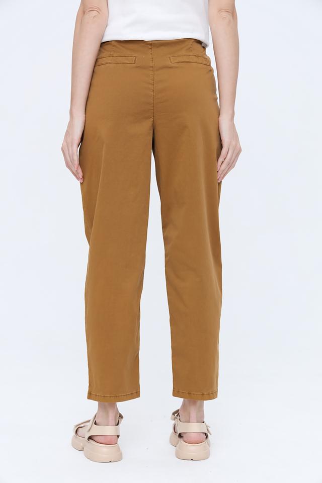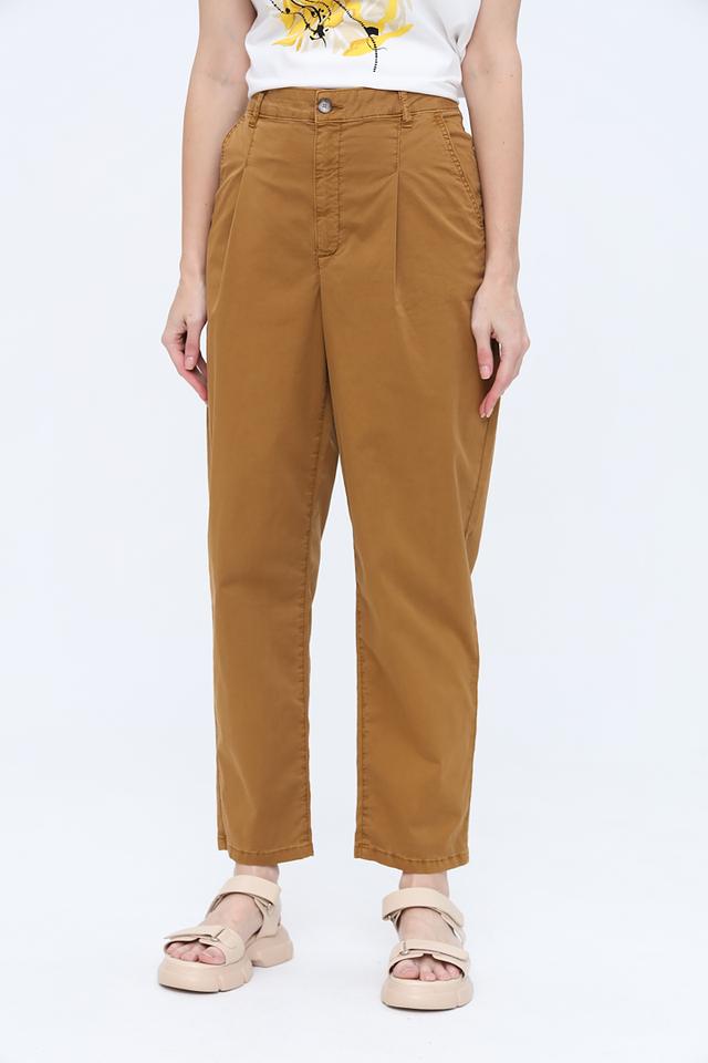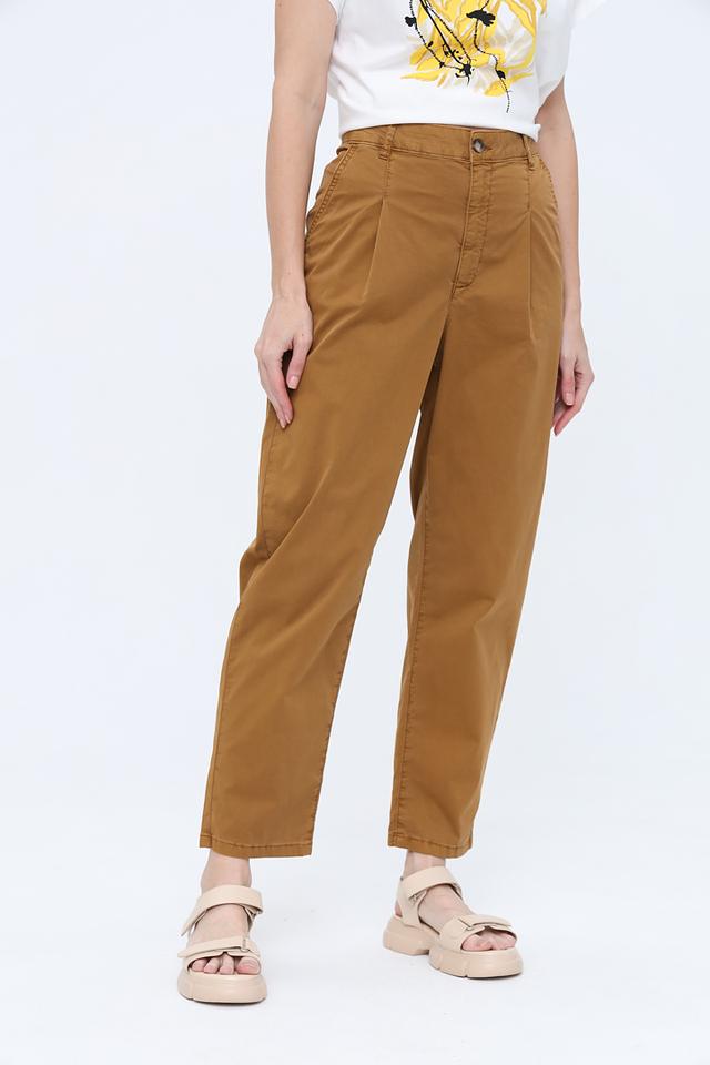 Брюки имеют прямой крой и высокую посадку, что визуально удлиняет ноги и подчеркивает талию. Коричневый цвет делает их универсальными и легко сочетаемыми с различными элементами одежды. Модель дополнена аккуратными складками спереди, которые придают ей элегантный вид.