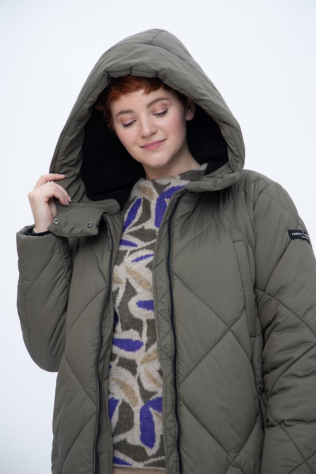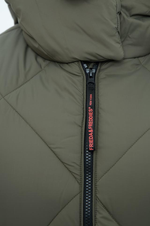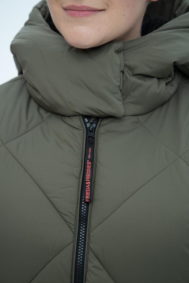 Стеганое пальто Frieda and Freddies цвета хаки – это стильное и теплое решение для прохладной погоды. Модель имеет удобный капюшон и практичные боковые карманы, а также эффектную подкладку с принтом. Состав: полиэстер 100%