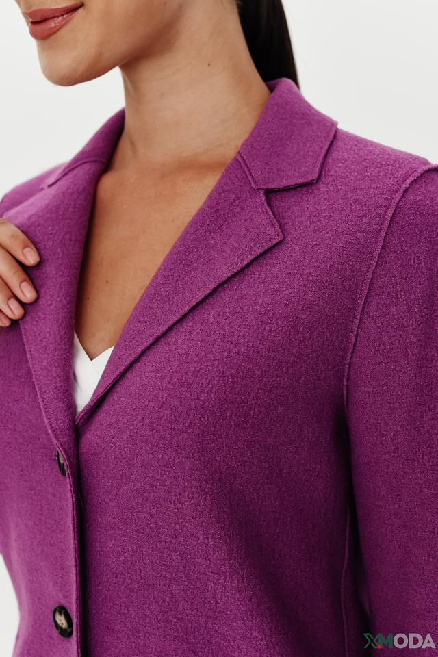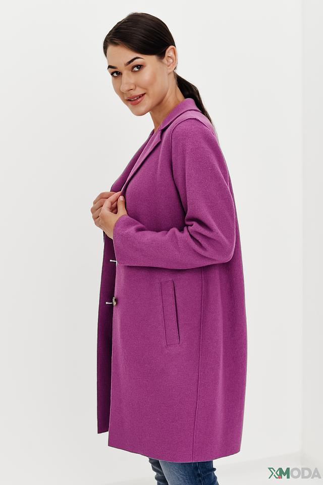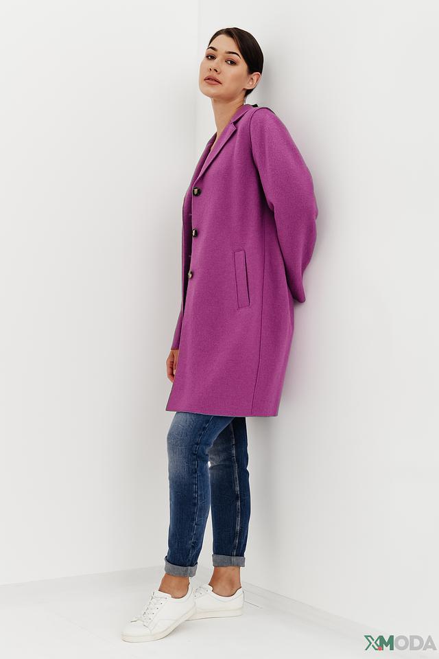 Пальто выполнено в ярком фуксиевом цвете, что делает его заметным и стильным элементом гардероба. Застежка на три пуговицы позволяет регулировать степень прилегания. Накладные карманы добавляют практичности.