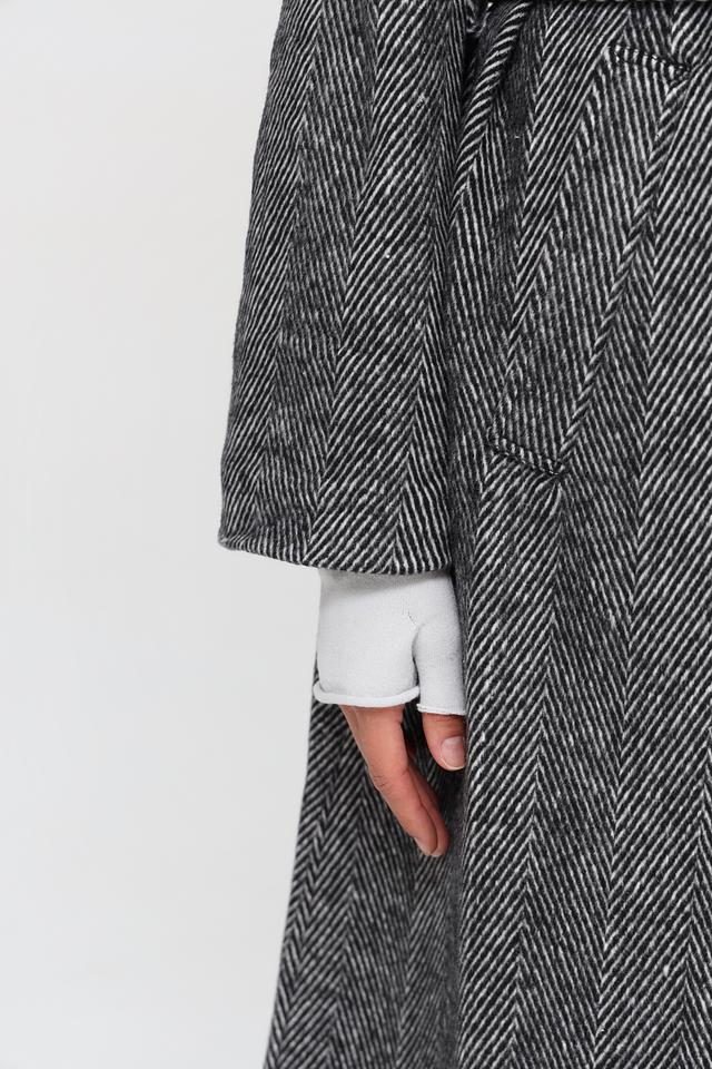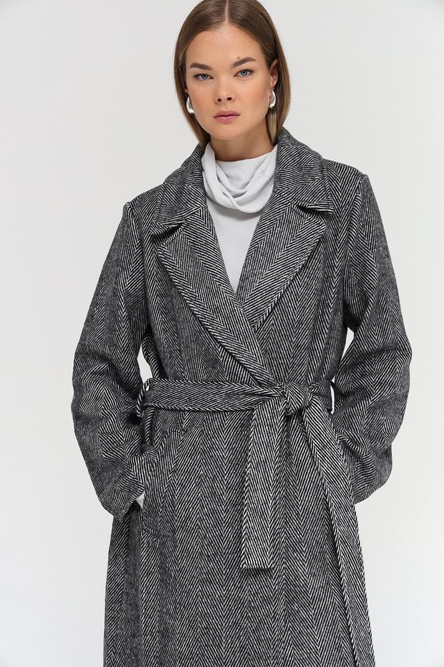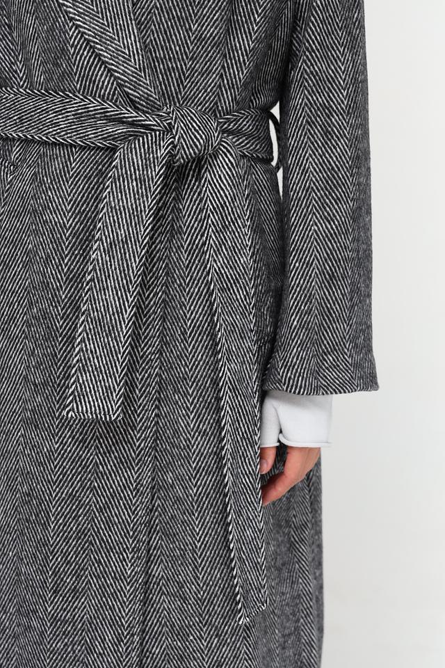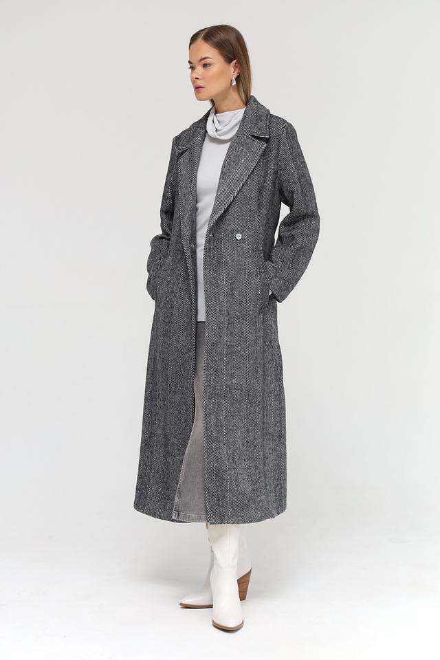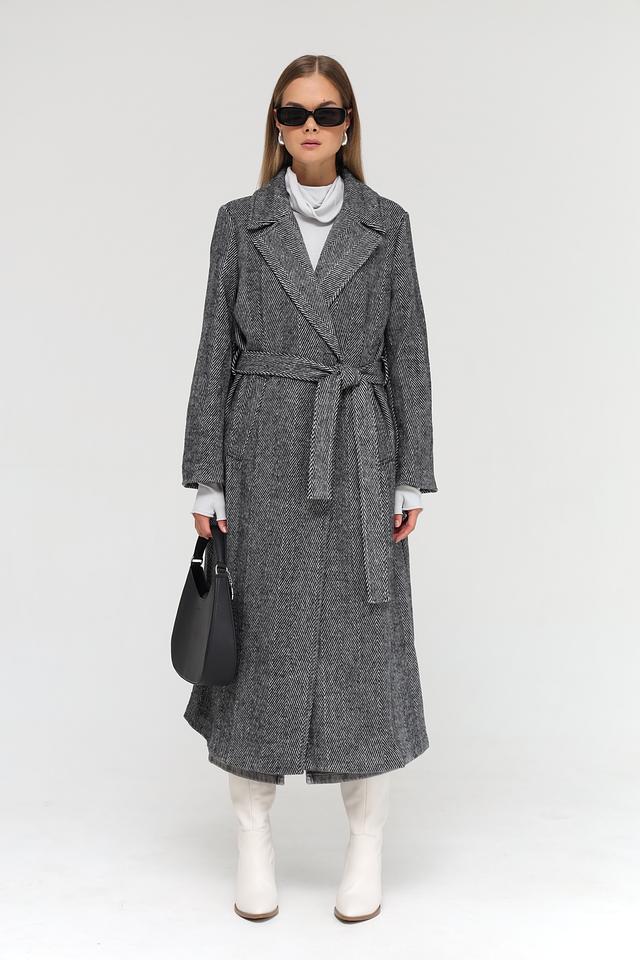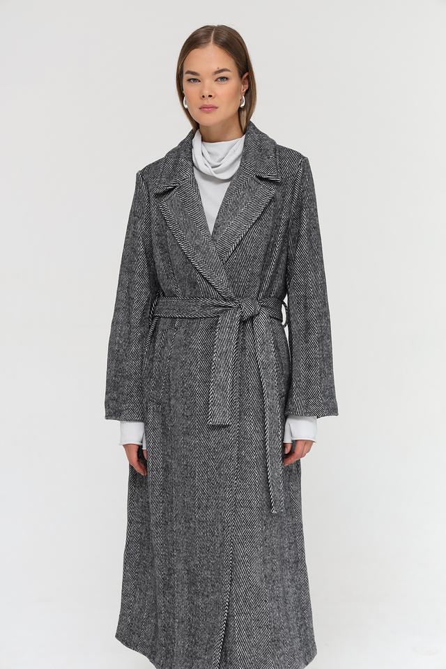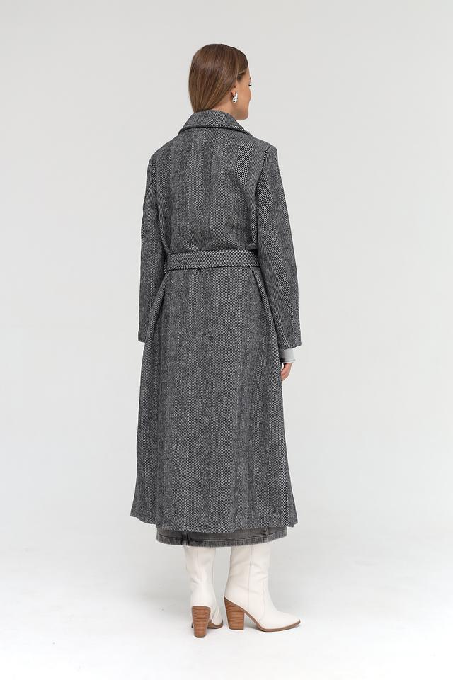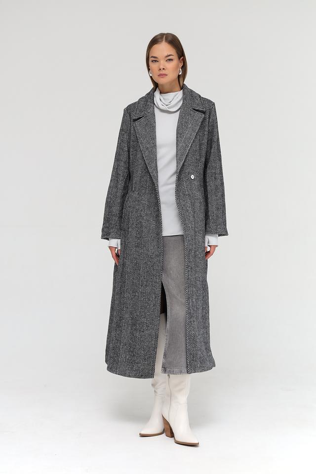 Пальто застегивается на одну пуговицу и дополнительно комплектуется поясом, позволяющим подчеркнуть талию и создать более женственный силуэт. Длинные рукава и отложной воротник обеспечивают защиту от холода.
