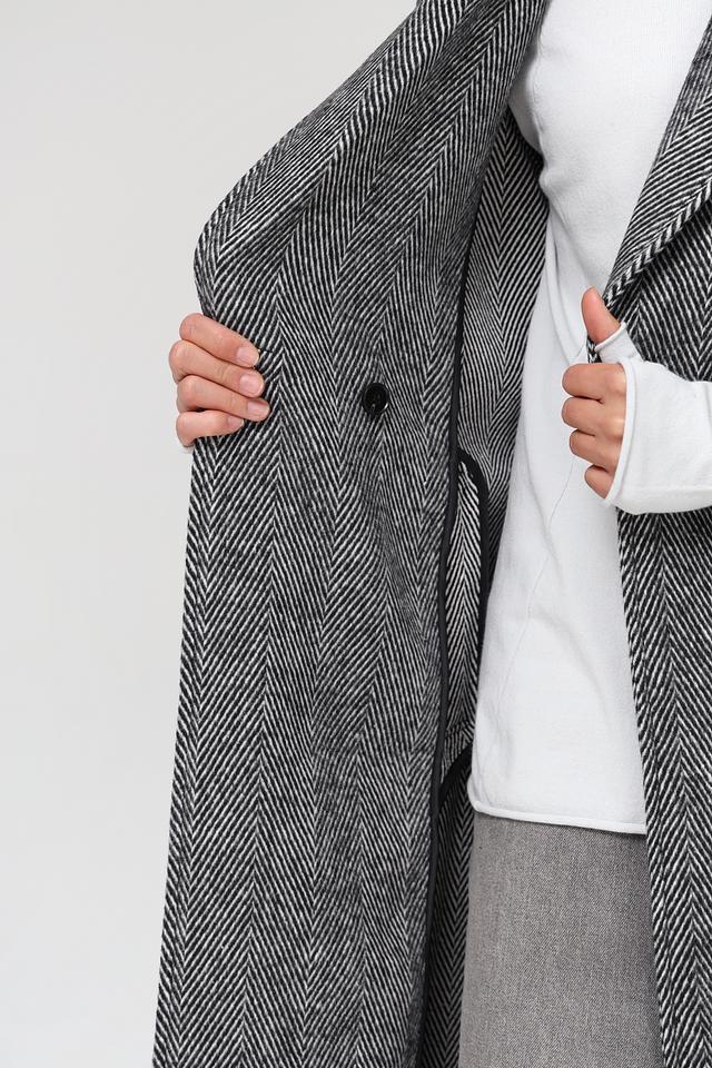 Пальто от бренда Oui выполнено в сером цвете с классическим клетчатым узором. Модель имеет прямой крой, который подходит для создания различных образов.