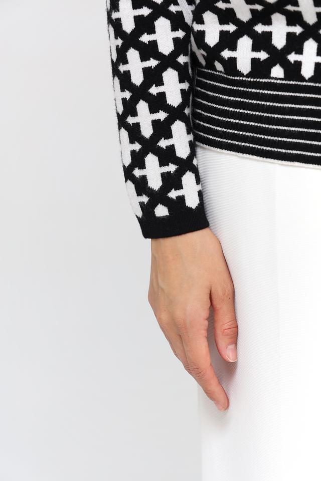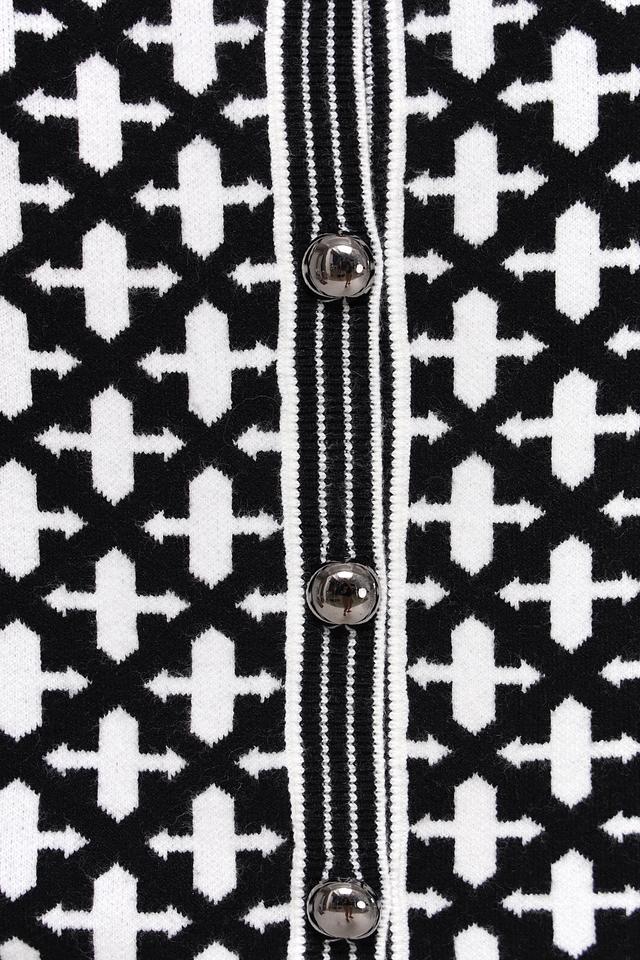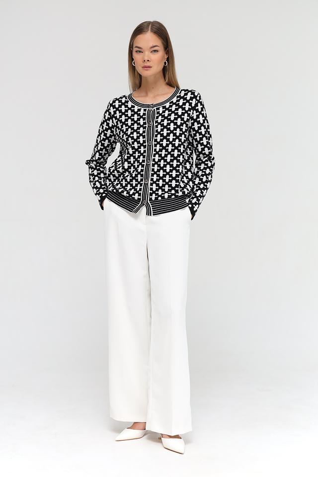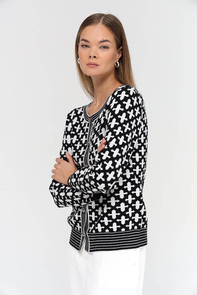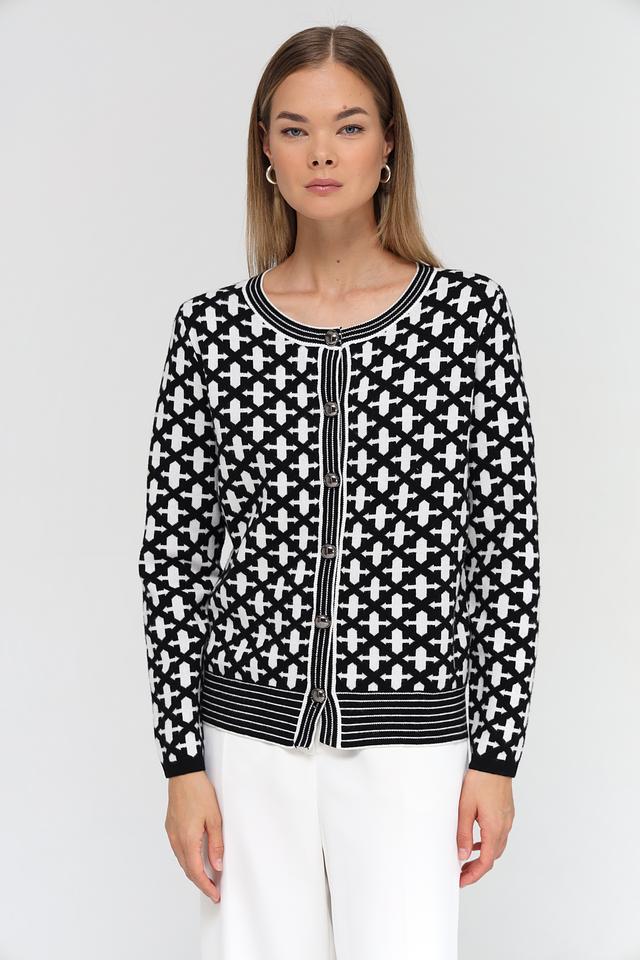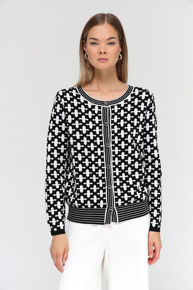 Жакет Passioni чёрно-белого цвета с геометрическим узором станет стильным дополнением к вашему гардеробу. Модель выполнена из мягкого трикотажа и застегивается на пуговицы. Состав: вискоза 65%, полиамид 20%, полиэстер 15%