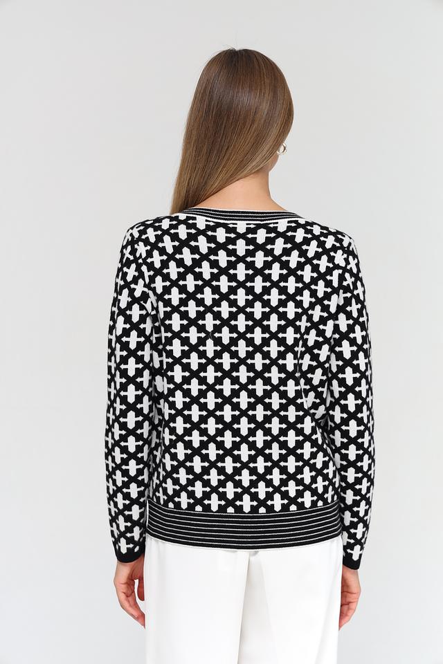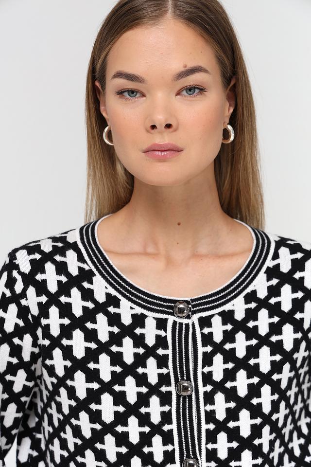 Основной цвет жакета – чёрный, дополненный белым геометрическим узором в виде клетки. Застёжка выполнена в виде ряда небольших пуговиц в тон основной ткани. Жакет имеет трикотажную текстуру, что обеспечивает комфорт в носке.