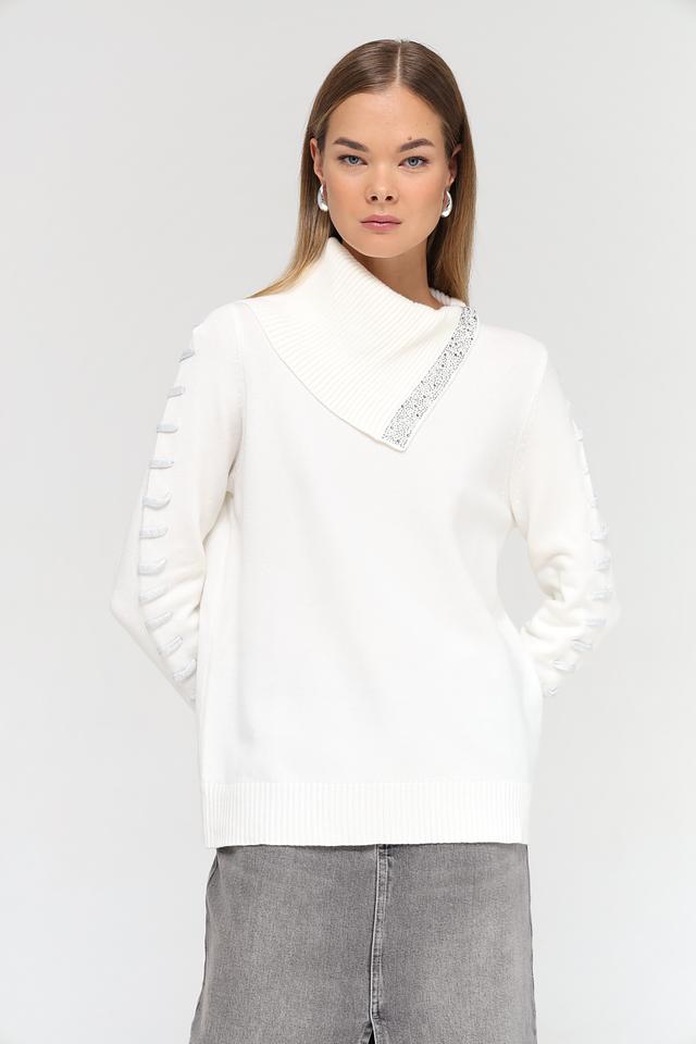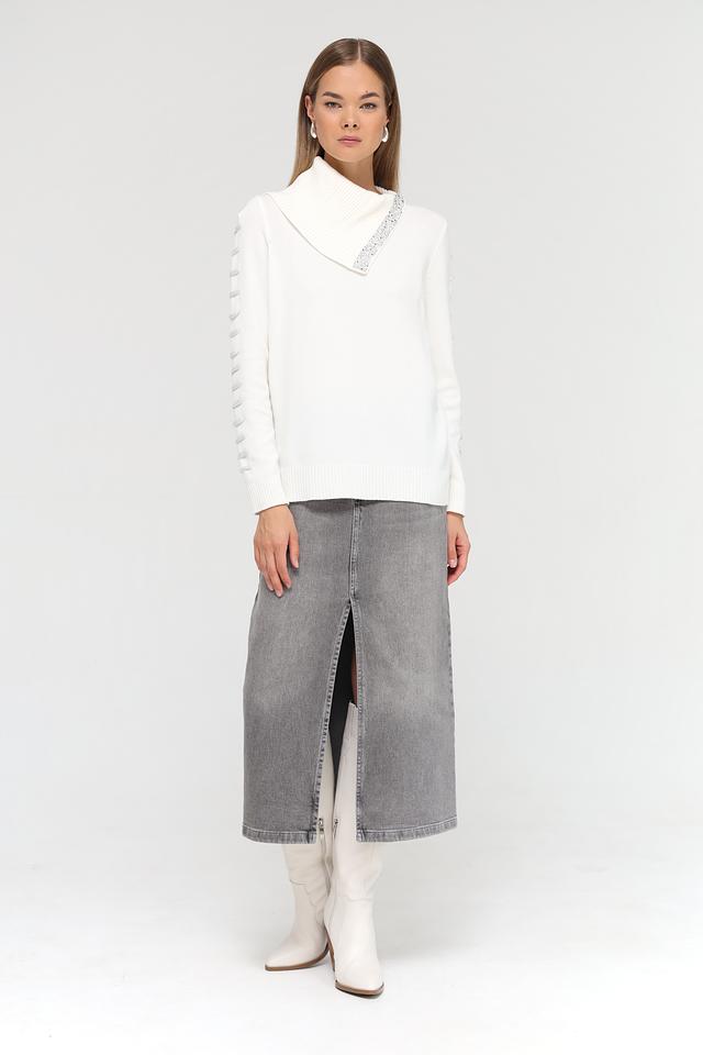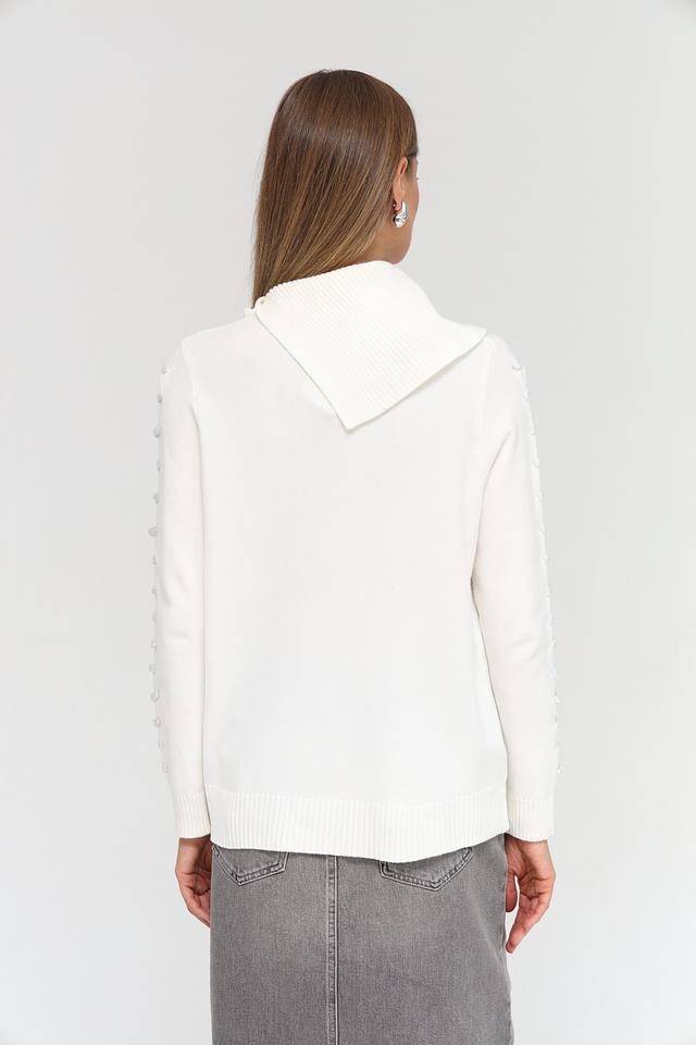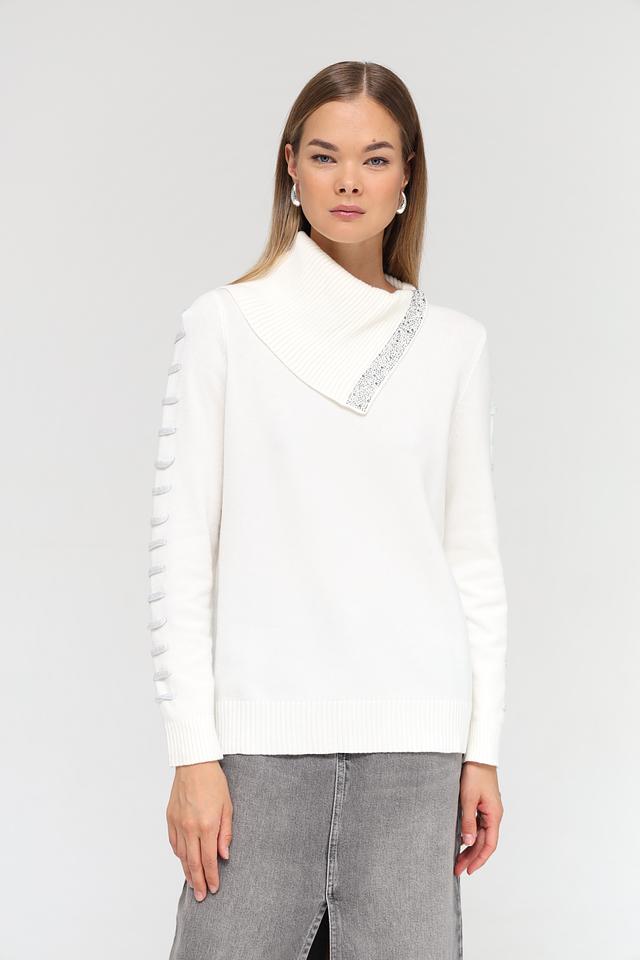 Белый пуловер Passioni с асимметричным воротником и декором из страз – стильное и элегантное решение для создания женственного образа. Модель выполнена из мягкого трикотажа, обеспечивающего комфорт в носке. Состав: вискоза 65%, полиамид 20%, полиэстер 15%