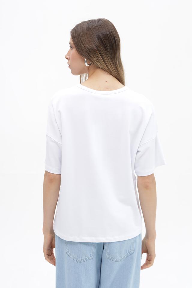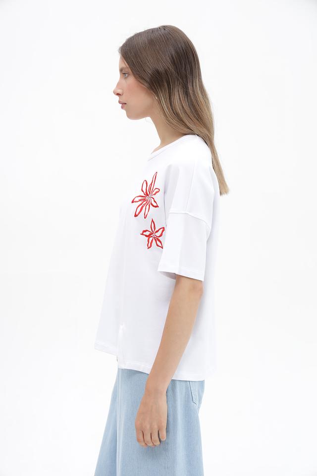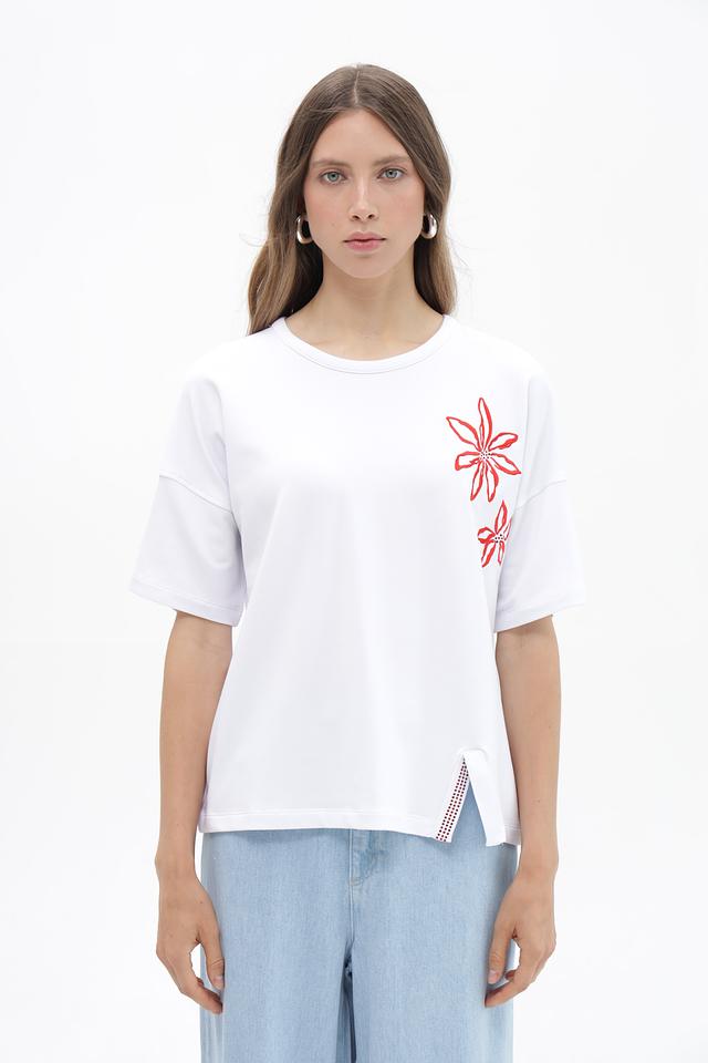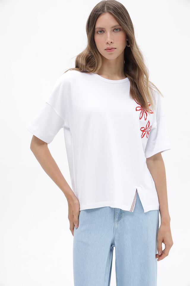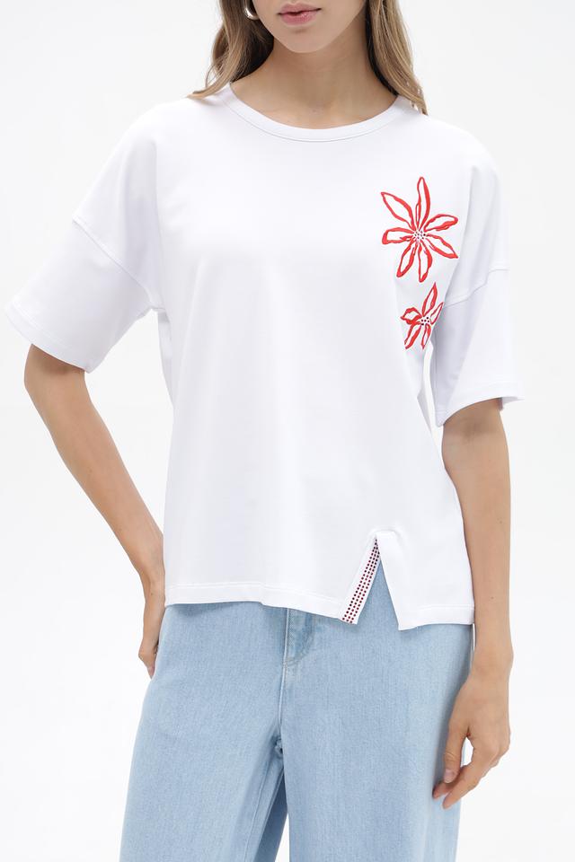 Белая футболка Passioni с вышивкой в виде красных цветов. Изготовлена из мягкого хлопка с добавлением модала и эластана для комфорта и хорошей посадки. Состав: хлопок 47%, модал 47%, эластан 6%