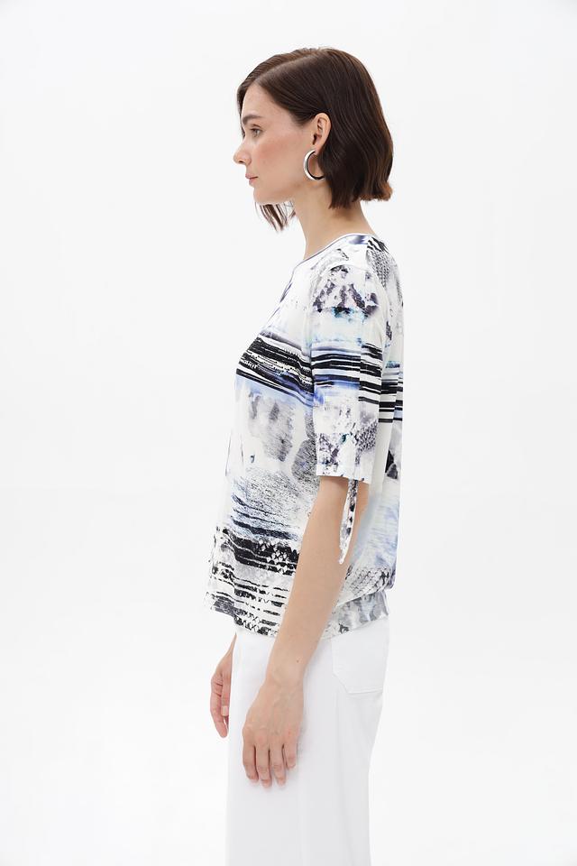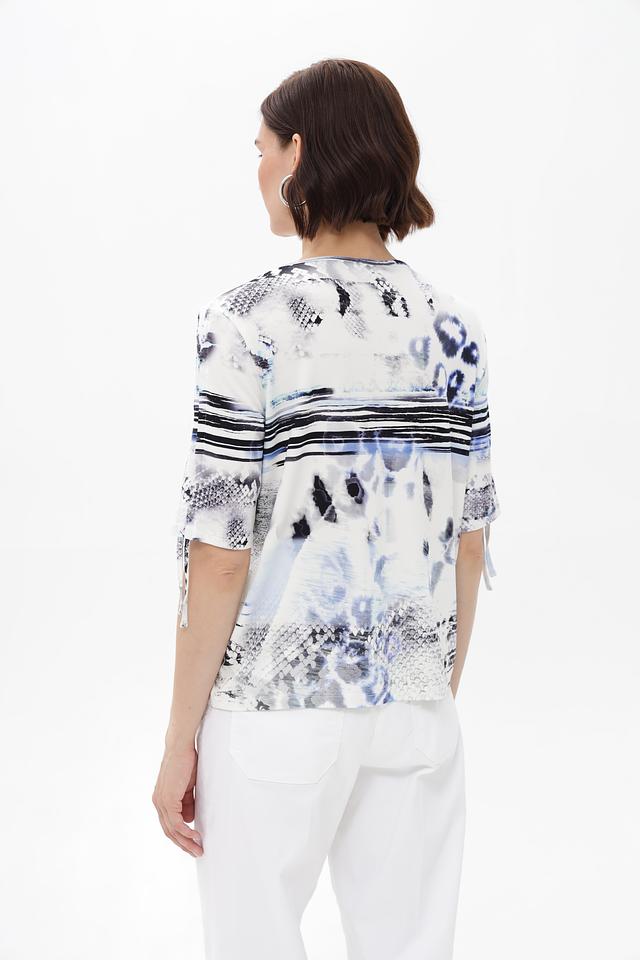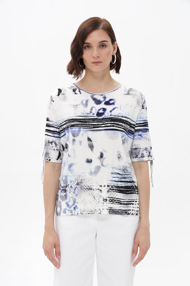 Особенностью данной модели является яркий и необычный абстрактный принт в сине-черных тонах на белом фоне. Футболка имеет прямой крой и короткие рукава, что делает ее универсальной для различных образов.