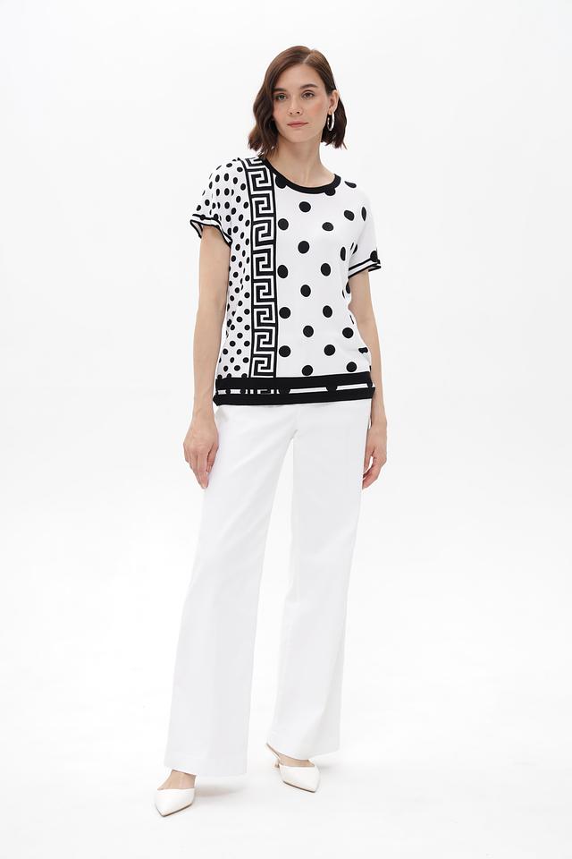 Белый пуловер Passioni с оригинальным принтом в горошек и геометрическим узором. Изготовлен из мягкой вискозы с добавлением полиамида для сохранения формы. Идеальный выбор для создания стильного и комфортного образа. Состав: вискоза 80%, полиамид 20%