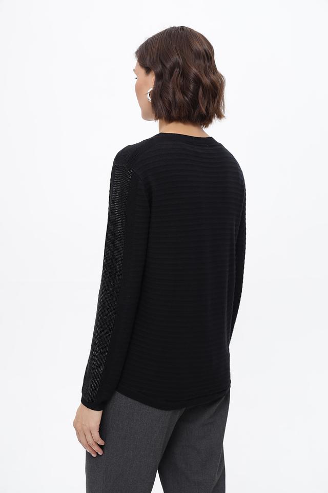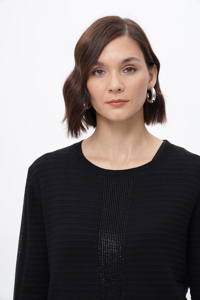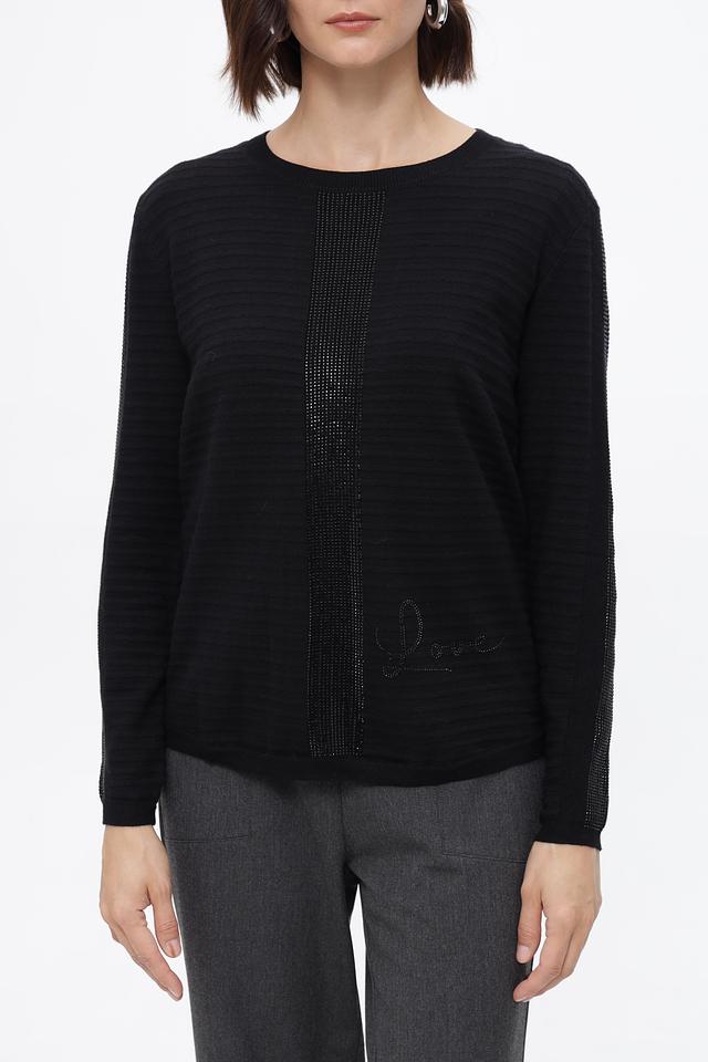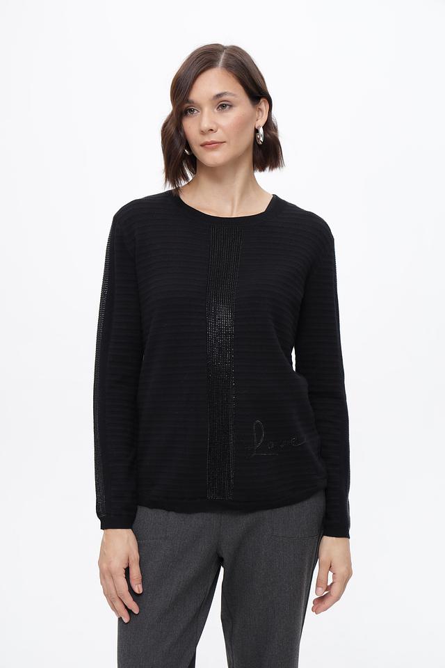 Основной цвет изделия – чёрный, что делает его универсальным дополнением к любому гардеробу. Пуловер украшен вертикальной полосой из сверкающих страз и небольшой надписью “Love”, добавляя изысканности и индивидуальности.