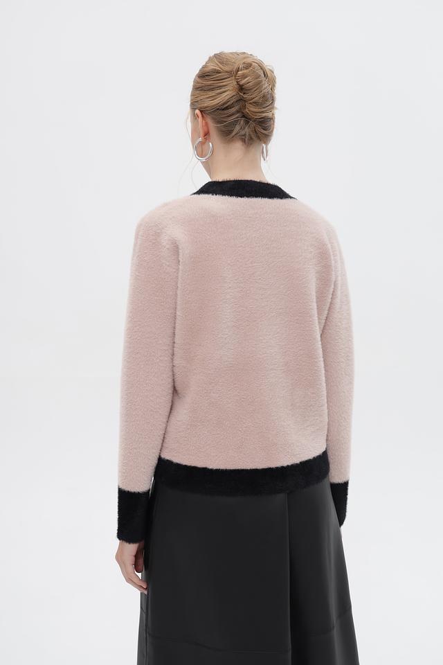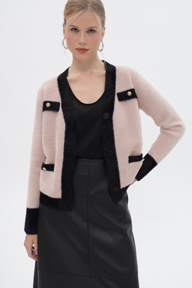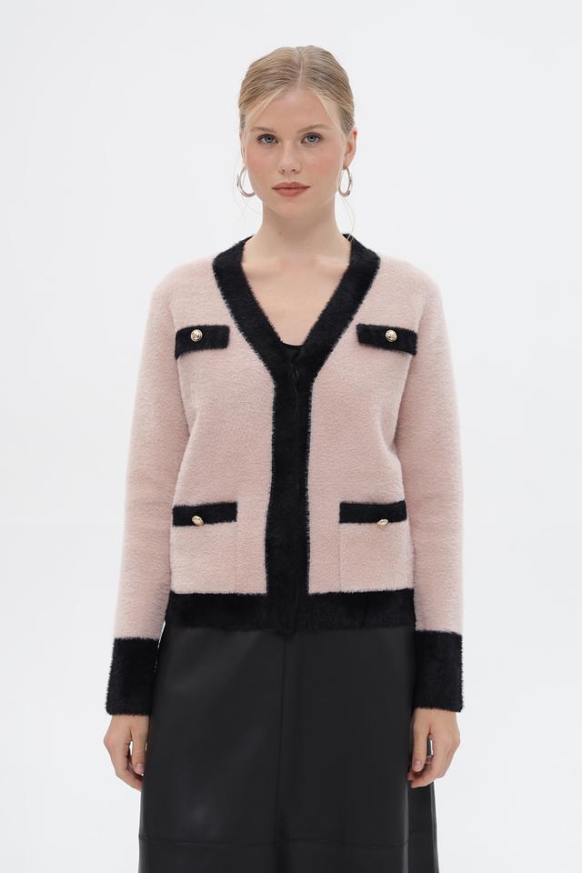 Женский жакет Passioni выполнен в нежном розовом цвете с контрастной чёрной отделкой по краю, горловине и планкам. Модель имеет V-образный вырез и застегивается на декоративные пуговицы золотистого цвета.