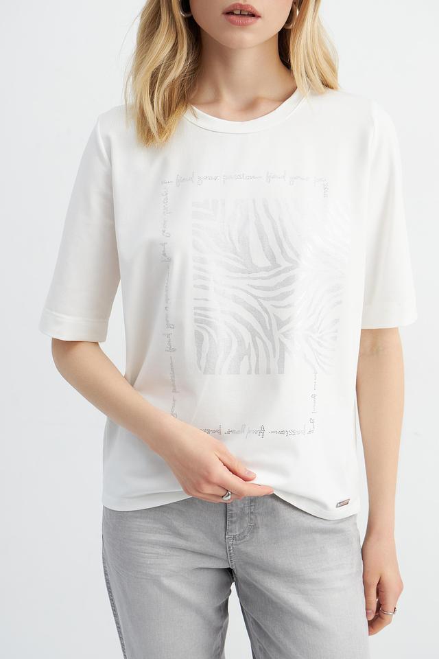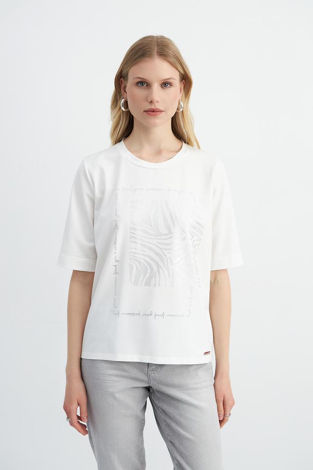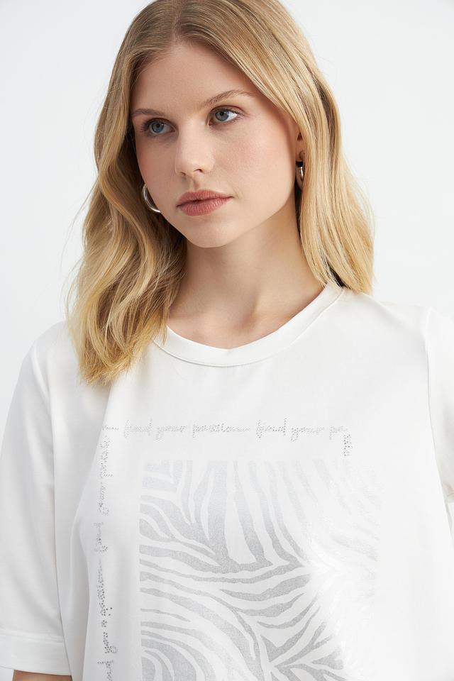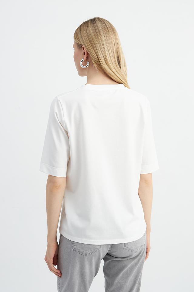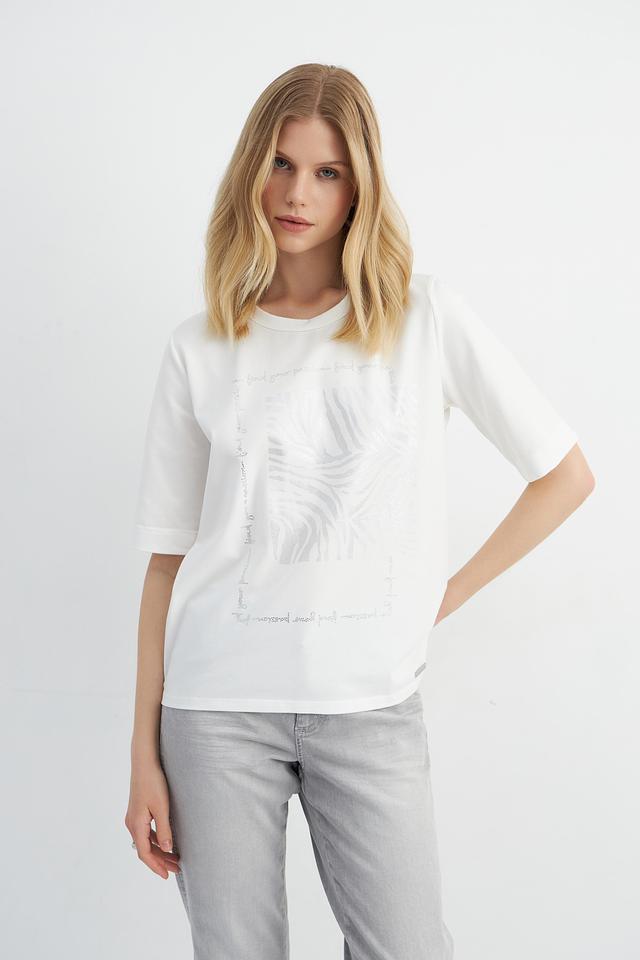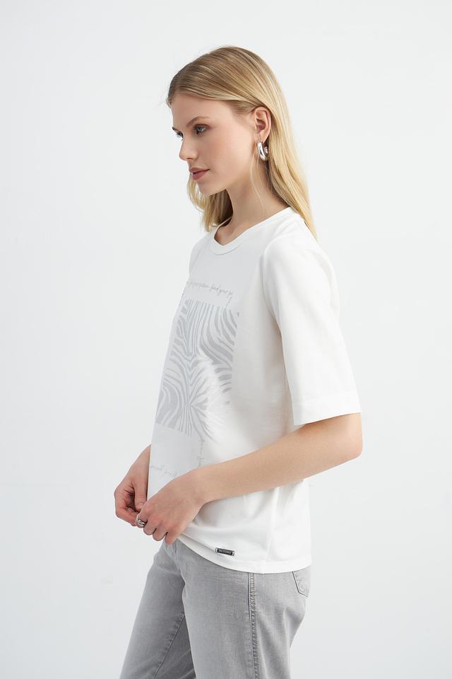Белая футболка Passioni с оригинальным графическим принтом. Изготовлена из мягкого хлопка с добавлением лиоцела и эластана для комфорта и хорошей посадки. Стильный и универсальный вариант для повседневного образа. Состав: хлопок 74%, лиоцел 18%, эластан 8%