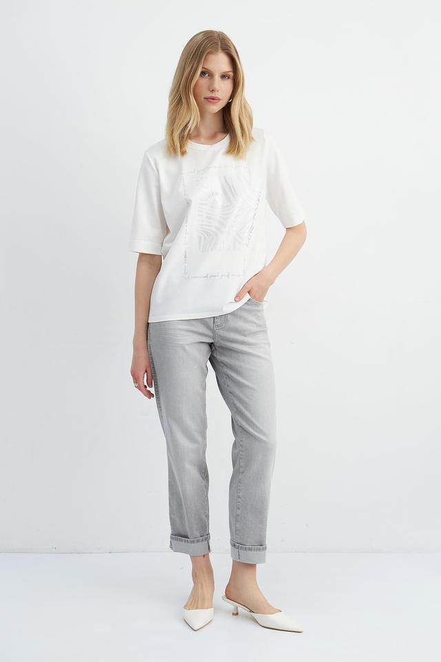 Особенностью данной модели является оригинальный графический принт в светло-серых тонах, который придает ей индивидуальность. Футболка имеет прямой крой и короткие рукава, что делает ее идеальной для теплой погоды.