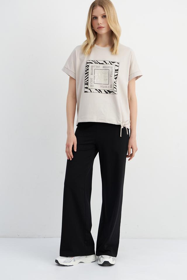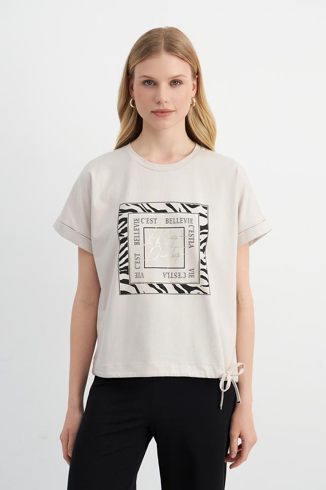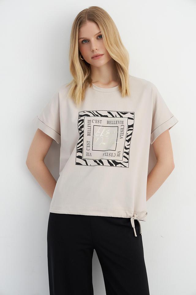 Эта футболка от Passioni станет отличным дополнением к вашему гардеробу. Она выполнена в нежном бежевом цвете и украшена стильным принтом с графическими элементами.