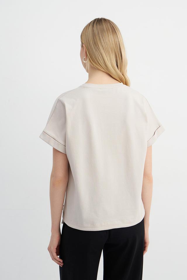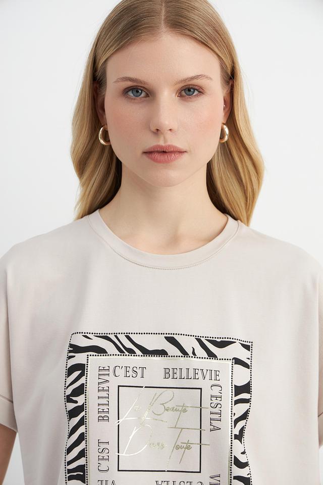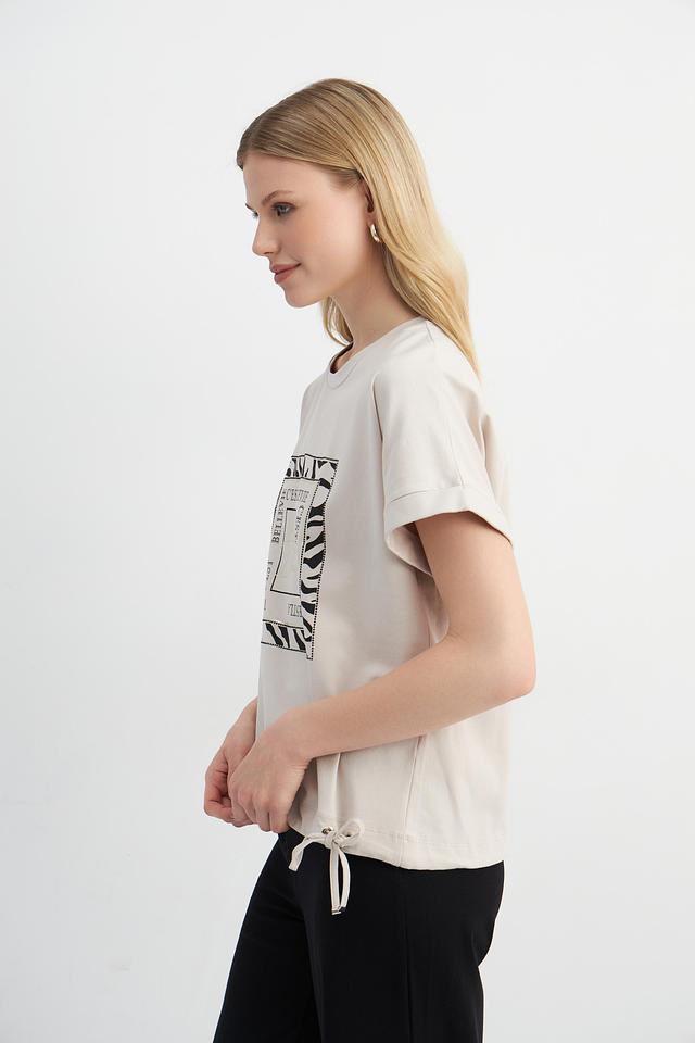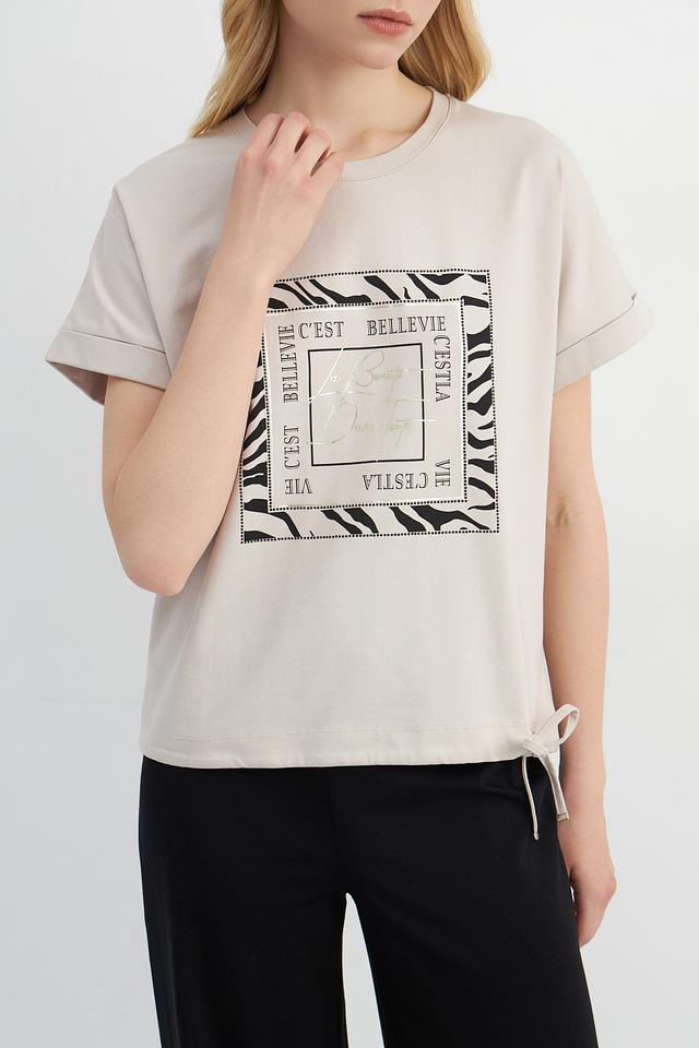 Бежевая футболка Passioni с оригинальным принтом – стильное и комфортное решение для повседневного образа. Изготовлена из мягкой вискозы с добавлением эластана, обеспечивающего удобную посадку. Состав: вискоза 95%, эластан 5%