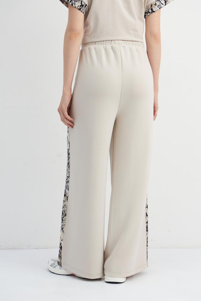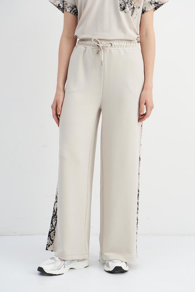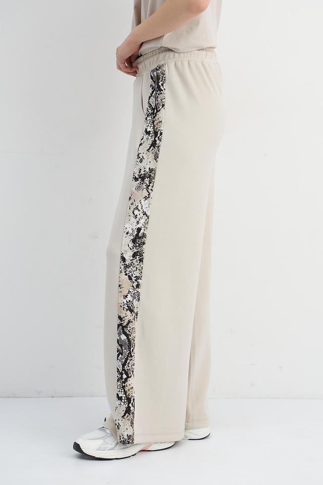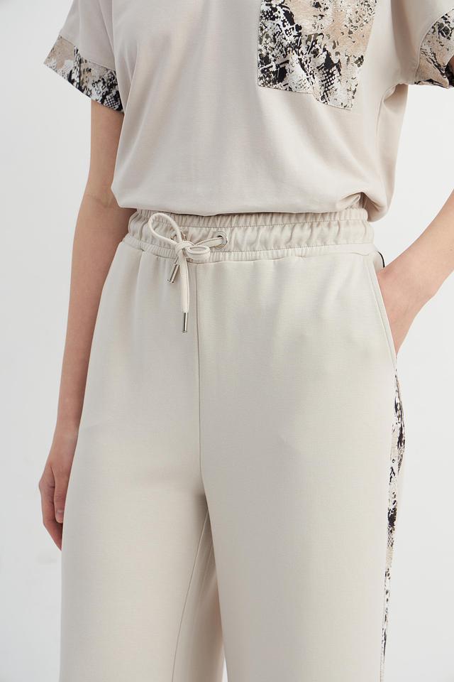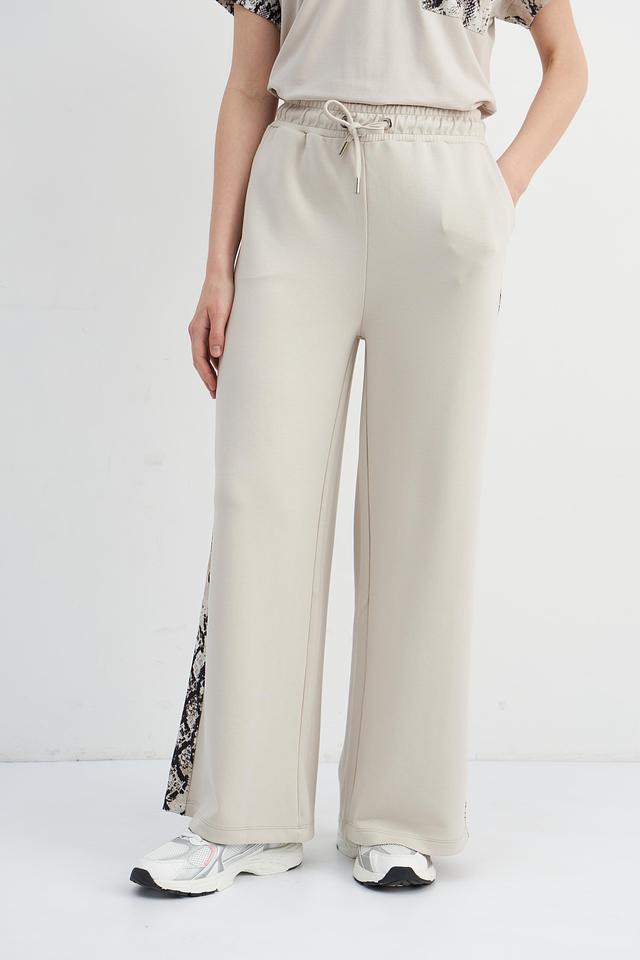 Особенностью модели является боковая полоса с принтом, добавляющая брюкам оригинальности и стиля. Брюки изготовлены из приятной к телу ткани, состоящей из 55% вискозы, 40% полиэстера и 5% эластана, что обеспечивает комфорт при носке и сохранение формы.