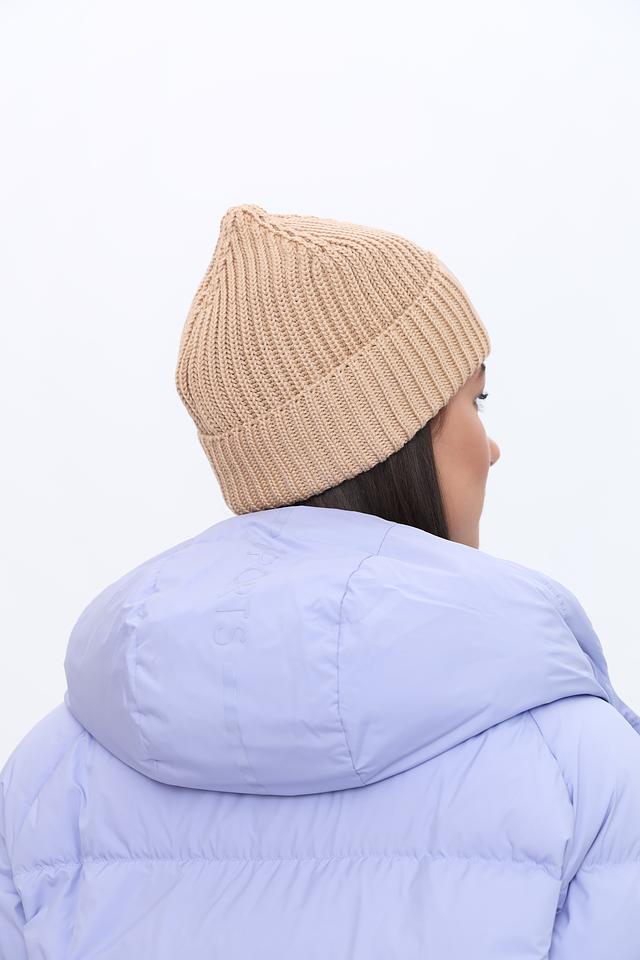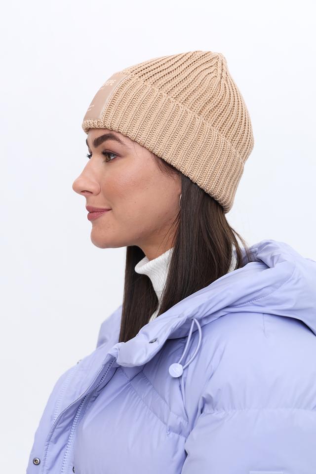 Шапка имеет классический дизайн и нейтральный бежевый цвет, который легко сочетается с различными стилями одежды. На передней части шапки расположена нашивка с логотипом бренда, добавляющая ей узнаваемости.