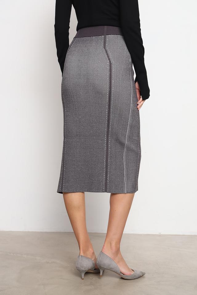 Модель имеет приталенный крой и длину миди, а также стильный разрез сзади, добавляющий образу динамичности. Эластичный пояс обеспечивает комфортную посадку по фигуре.