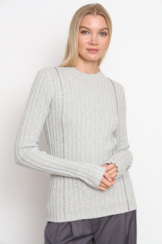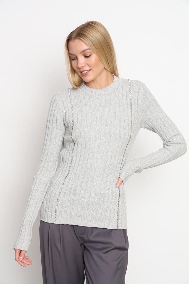 Джемпер имеет классический силуэт с длинными рукавами и округлым вырезом горловины. Особый акцент сделан на декор в виде цепочек, которые расположены по бокам изделия, придавая ему изысканность и оригинальность.