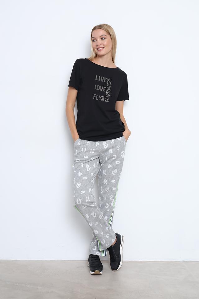 Основным акцентом футболки является оригинальный принт "LIVE LOVE FLY", выполненный в серебристом цвете. Он добавляет образу изюминку и выражает позитивный настрой.
